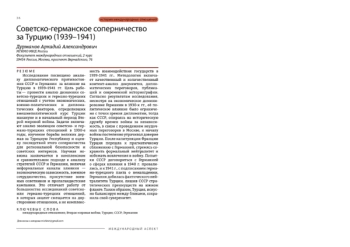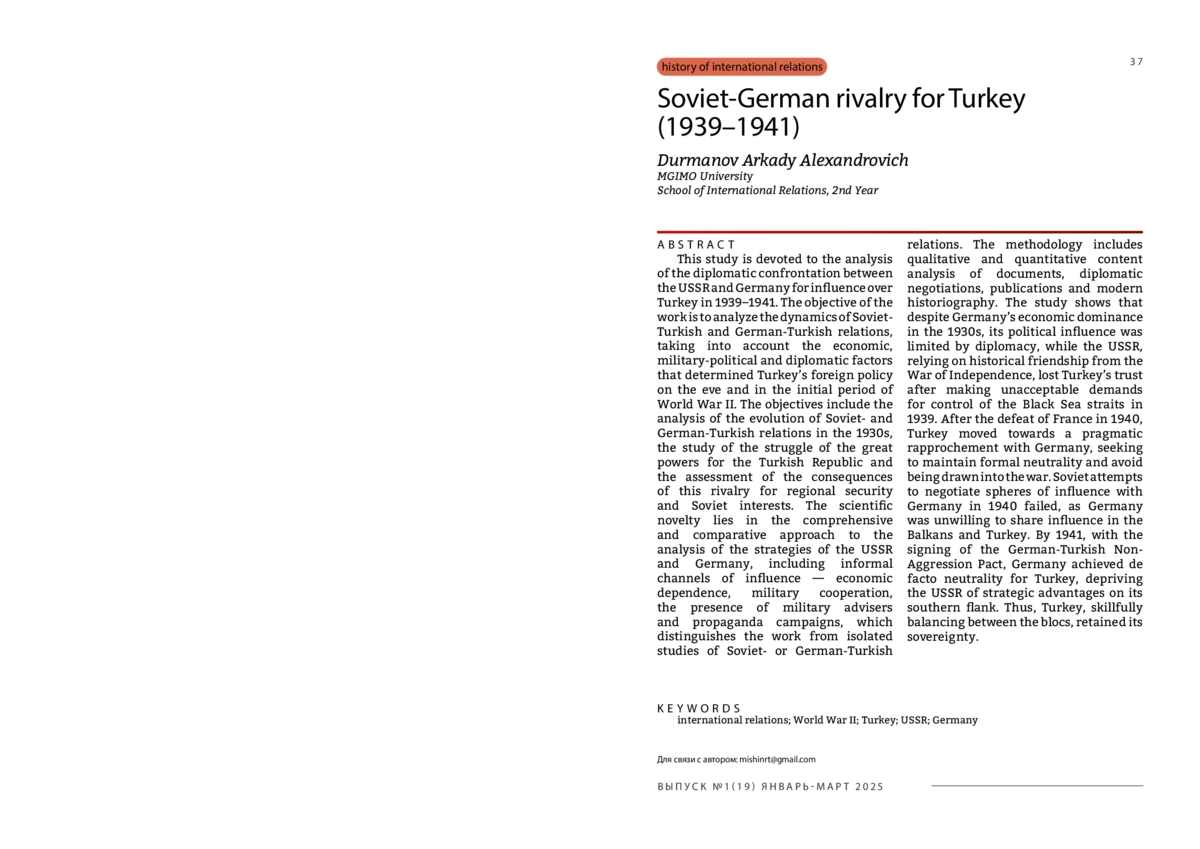 Исследование посвящено анализу дипломатического противостояния СССР и Германии за влияние на Турцию в 1939–1941 гг. Цель работы — провести анализ динамики советско-турецких и германо-турецких отношений с учетом экономических, военно-политических и дипломатических факторов, определивших внешнеполитический курс Турции накануне и в начальный период Второй мировой войны. Задачи включают анализ эволюции советско- и германо-турецких отношений в 1930-е годы, изучение борьбы великих держав за Турецкую Республику и оценку последствий этого соперничества для региональной безопасности и советских интересов. Научная новизна заключается в комплексном и сравнительном подходе к анализу стратегий СССР и Германии, включая неформальные каналы влияния — экономическую зависимость, военное сотрудничество, присутствие военных советников и пропагандистские кампании. Это отличает работу от большинства исследований советско- или германо-турецких отношений, в которых акцент смещается на двусторонние отношения, а не комплексность взаимодействия государств в 1939-1941 гг.. Методология включает качественный и количественный контент-анализ документов, дипломатических переговоров, публикаций и современной историографии. Согласно результатам исследования, несмотря на экономическое доминирование Германии в 1930-х гг., её политическое влияние было ограничено с точки зрения дипломатии, тогда как СССР, опираясь на историческую дружбу времен войны за независимость, в связи с проведением неудачных переговоров в Москве, к началу войны постепенно утрачивал доверие Турции. После капитуляции Франции Турция перешла к прагматичному сближению с Германией, стремясь сохранить формальный нейтралитет и избежать вовлечения в войну. Попытки СССР договориться с Германией о сферах влияния в 1940 г. провалились, и к 1941 г., с подписанием германо-турецкого пакта о ненападении, Германия добилась фактического нейтралитета Турции, лишив СССР стратегических преимуществ на южном фланге. Таким образом, Турция, искусно балансируя между блоками, сохранила свой суверенитет.