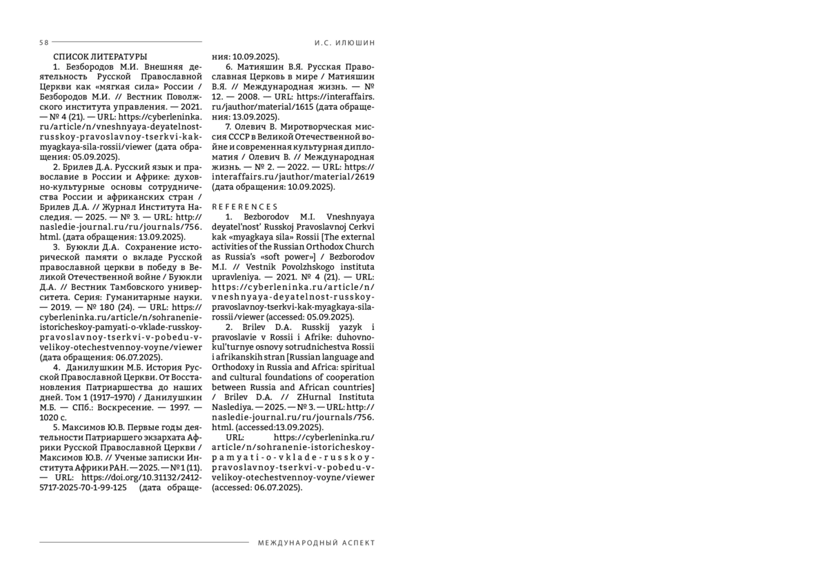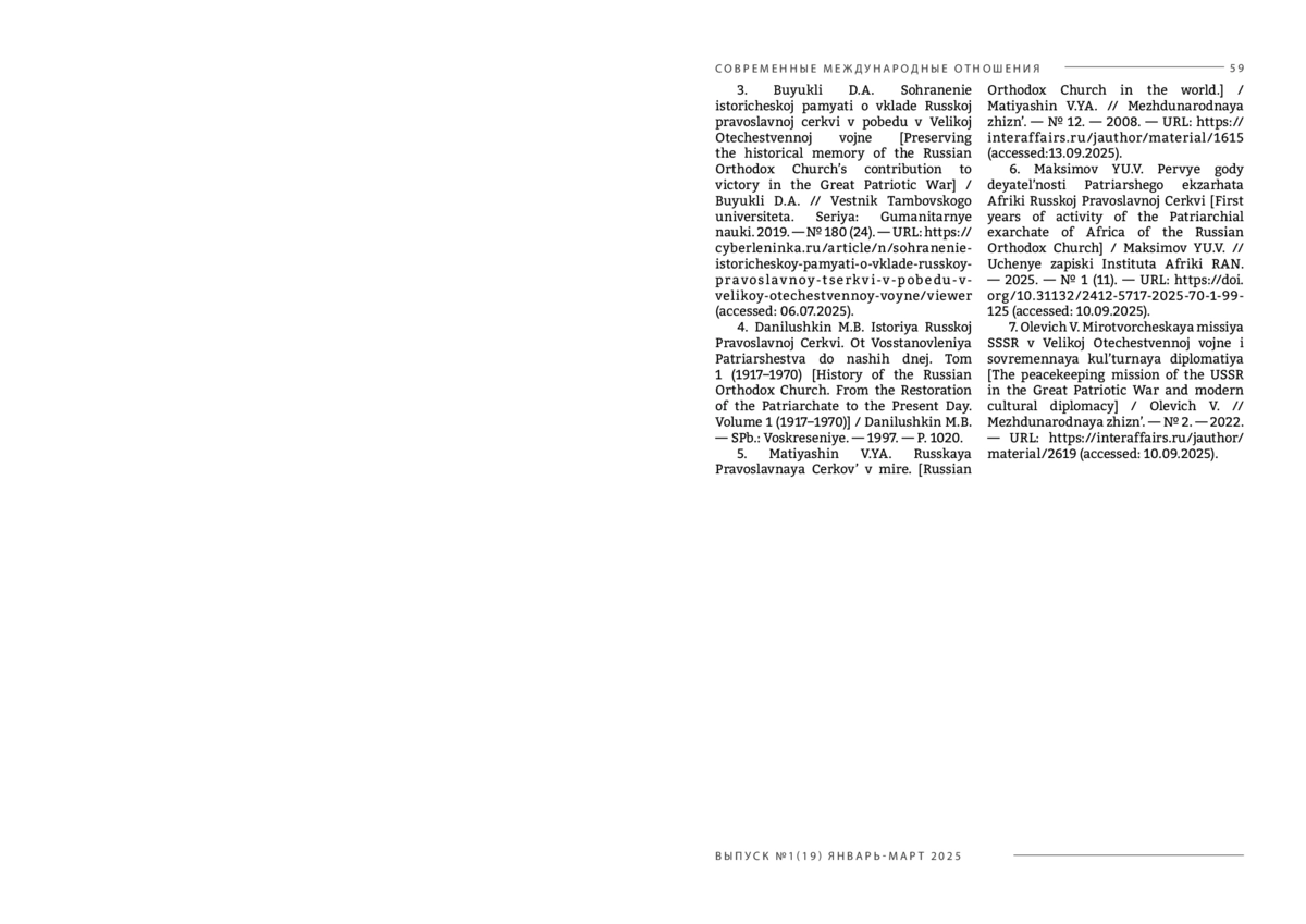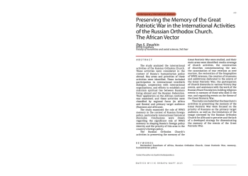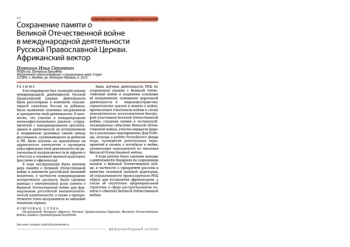 В исследовании был проведён анализ международной деятельности Русской Православной Церкви. Деятельность была рассмотрена в контексте гуманитарной политики России за рубежом. Были выявлены основные направления и приоритеты этой деятельности. В частности, это участие в международном межконфессиональном диалоге, сотрудничество с международными организациями и деятельность по установлению и сохранению духовных связей между россиянами, проживающими за рубежом и РФ. Было изучено их применение на африканском континенте и проведена классификация этой деятельности по региональной направленности (в Африке и в России) и основной целевой аудитории (россияне и африканцы). В ходе исследования была изучена роль памяти о Великой Отечественной войне в контексте российской внешней политики, в частности международном историческом дискурсе. Были сделаны выводы о значительной роли памяти о Великой Отечественной войне для формирования российской внешнеполитической идентичности, а также о приоритетности этого направления во внешней политике страны. Была изучена деятельность РПЦ по сохранению памяти о Великой Отечественной войне и выделены основные её направления: освещение церковной деятельности в медиапространстве, строительство храмов в память о войне, причисление участников войны к сонму новомучеников, восстановление биографий участников Великой Отечественной войны, создание музеев и экспозиций, посвящённых событиям Великой Отечественной войны, участие иерархов Церкви в различных мероприятиях Дня Победы, помощь в работе Российского фонда мира, проведение религиозных мероприятий в память о погибших в войне, организация мероприятий по тематике Великой Отечественной войны. В ходе работы были сделаны выводы о деятельности Экзархата по сохранению памяти о Великой Отечественной войне, в частности о приоритете россиян в качестве основной целевой аудитории, об ограниченности транслируемого РПЦ образа для восприятия африканцами, а также об отсутствии сформированной стратегии в сфере распространения памяти о событиях Великой Отечественной войны.