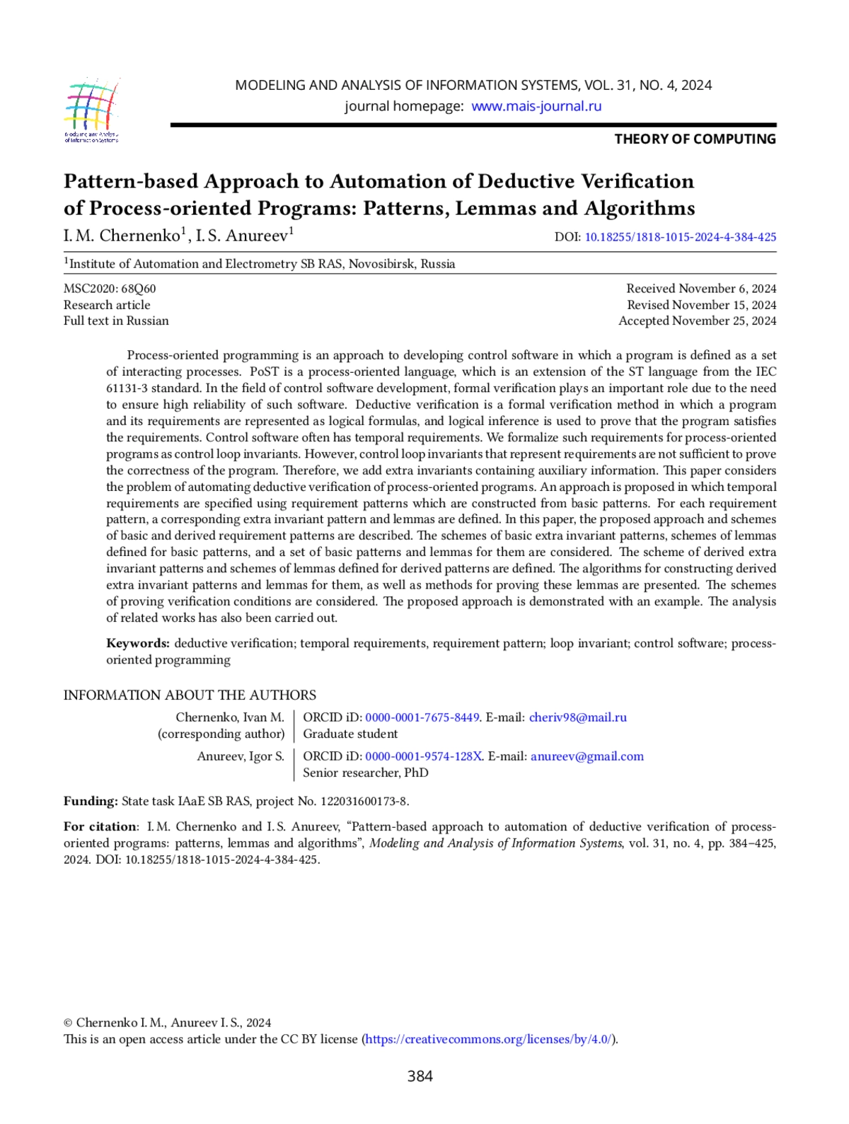 11. I. M. Chernenko, I. S. Anureev, and N. O. Garanina, “Requirement patterns in deductive verification of poST programs,” Modeling and Analysis of Information Systems, vol. 31, no. 1, pp. 6-31, 2024.