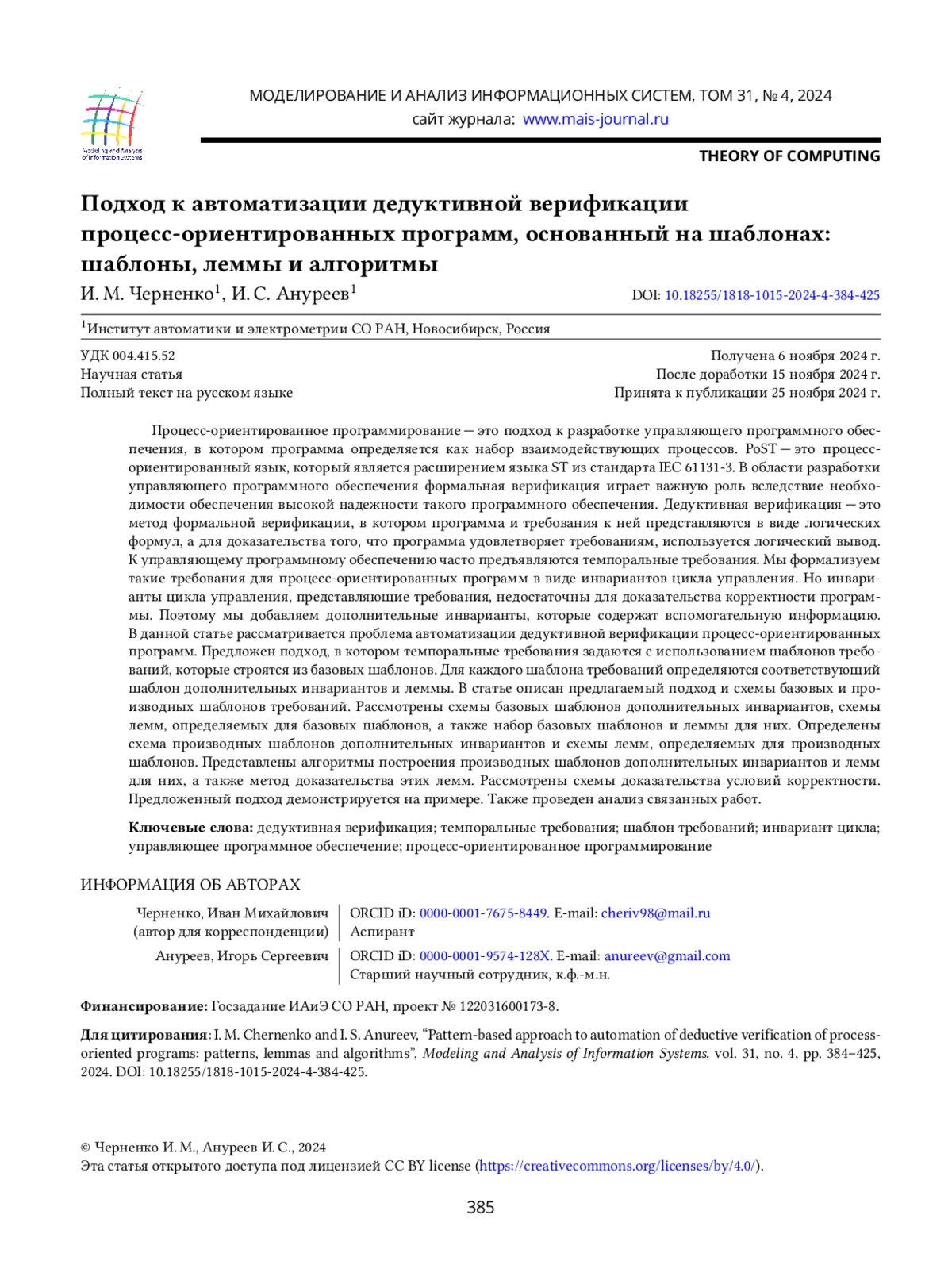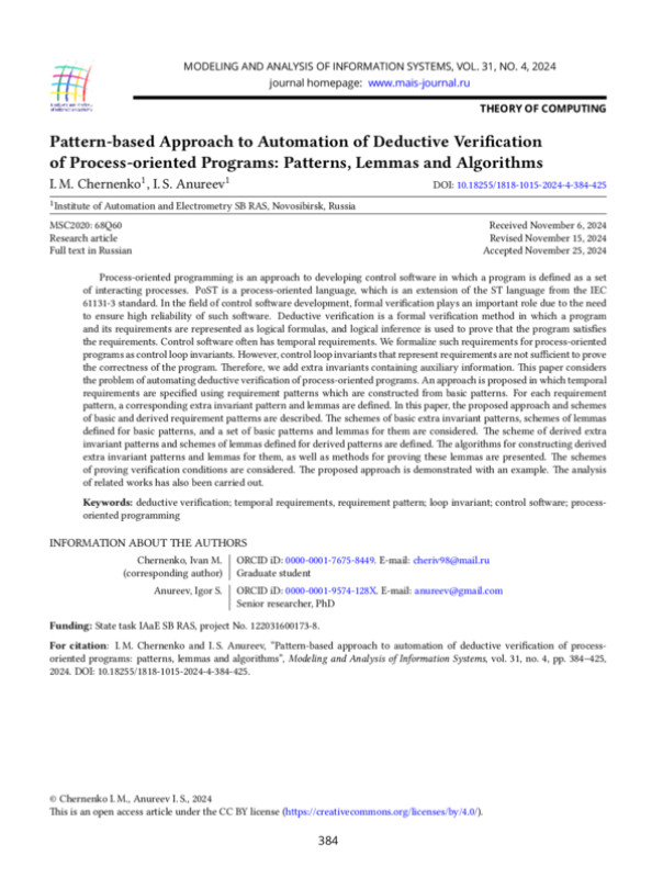 6. I. Chernenko, I. S. Anureev, N. O. Garanina, and S. M. Staroletov, “A temporal requirements language for deductive verification of process-oriented programs,” in Proceedings of the IEEE 23rd International Conference of Young Professionals in Electron Devices and Materials (EDM), 2022, pp. 657-662.