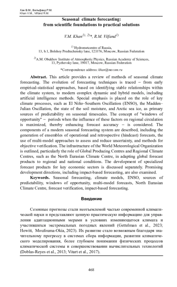 Представлен обзор методов сезонного климатического прогнозирования. Прослежена эволюция прогностических методов от ранних эмпирико-статистических подходов, основанных на выявлении устойчивых связей в климатической системе, до современных сложных динамических и динамико-статистических моделей, включая методы искусственного интеллекта. Особое внимание уделяется роли ключевых климатических процессов, таких как Эль-Ниньо Южное колебание, колебание Маддена– Джулиана, состояние влажности почвы и арктических морских льдов, как основных источников предсказуемости на сезонных масштабах. Рассмотрена концепция «окон возможностей» периодов, когда влияние этих факторов на региональную циркуляцию максимально, что позволяет повысить точность прогнозов. Описаны компоненты современной системы сезонного прогнозирования, включая генерацию ансамблей оперативных и ретроспективных прогнозов, использование мультимодельных подходов для оценки и снижения неопределенности, а также методы верификации. Освещена инфраструктура Всемирной метеорологической организации, в частности, роль глобальных центров долгосрочных прогнозов и региональных климатических центров, таких как Северо-Евразийский климатический центр, в адаптации глобальных прогностических продуктов к региональным условиям. Отдельно обсуждаются вопросы разработки специализированных прогностических продуктов для ключевых секторов экономики, а также перспективные направления развития, включая прогнозирование на основе воздействий (impact-based forecasting).