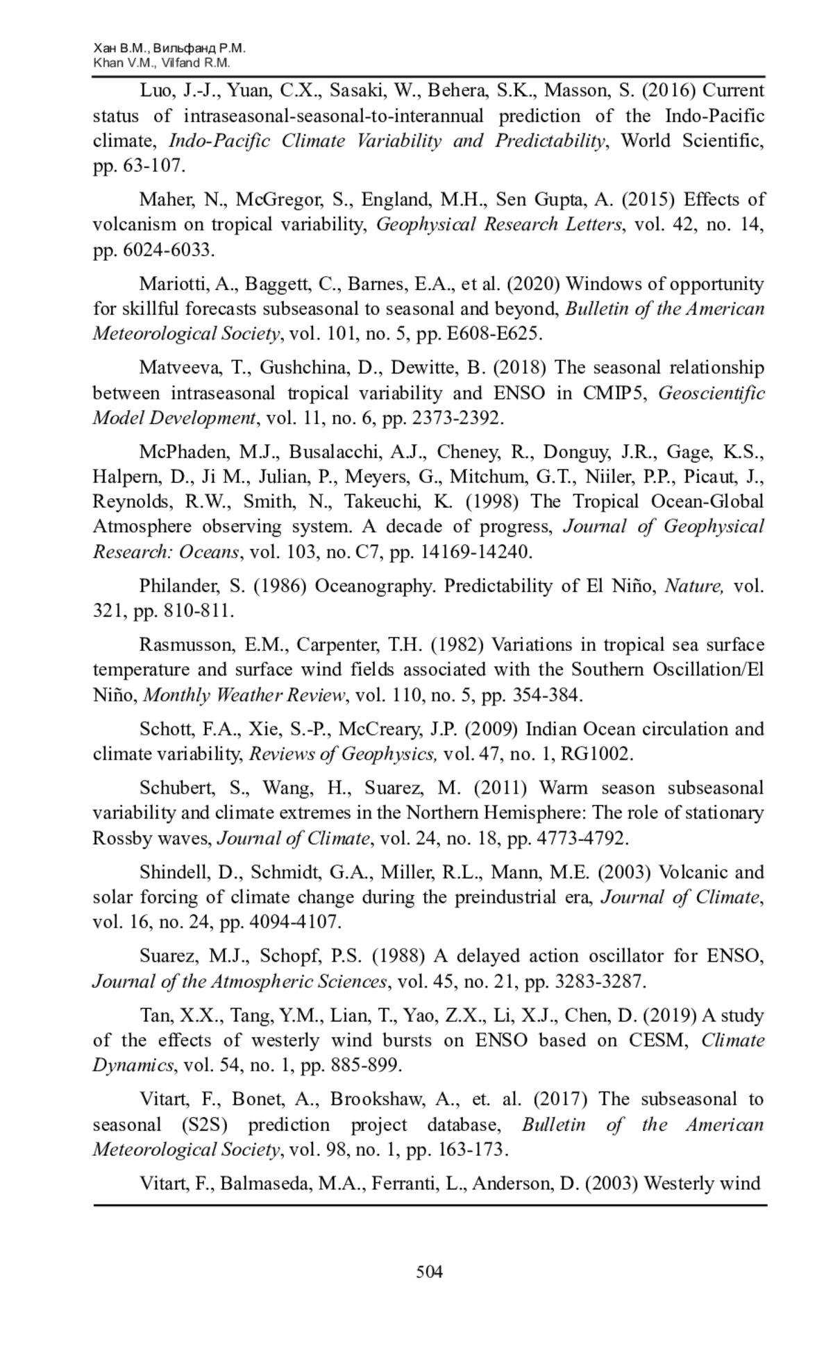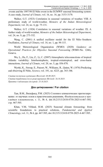 41. Полосин, А.С. (1975) Проблемы Эль-Ниньо, М., Наука, 136 с. Реснянский, Ю.Д., Зеленько, А.А., Струков, Б.С., Степанов, В.Н., Хан,В.М., Воробьева, В.В., Тарасевич, М.А., Грицун, А.С., Володин, Е.М. (2024) Оценка успешности воспроизведения океанографических полей в ретроспективных прогнозах по модели Земной системы INM-CM5, Метеорология и гидрология, № 3, с. 5-20.