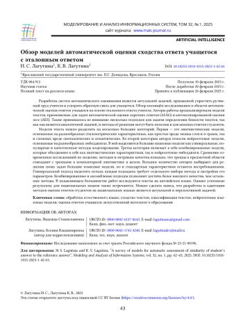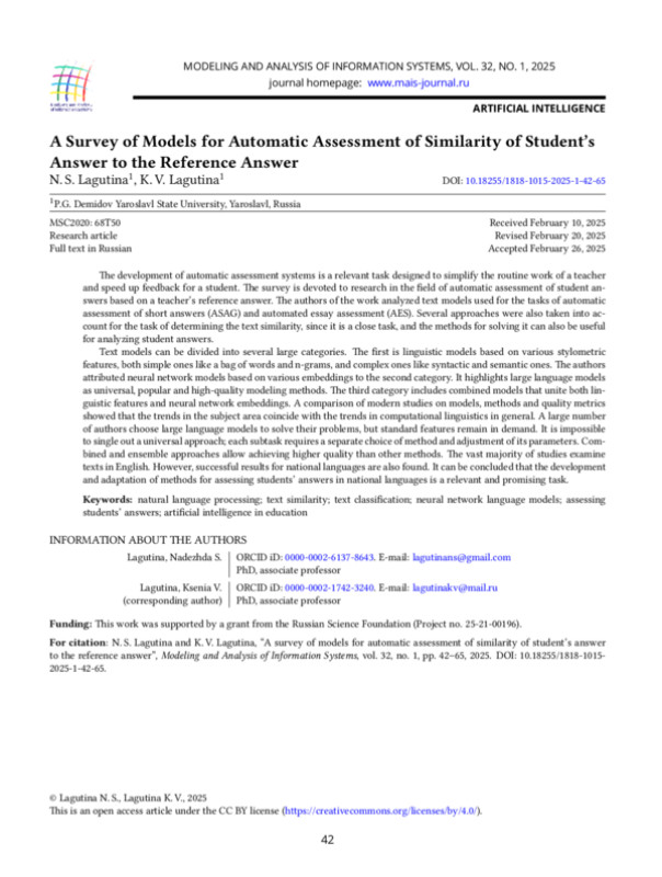 18. N. S. Lagutina, K. V. Lagutina, and V. N. Kopnin, “Automatic determination of semantic similarity of student answers with the standard one using modern models,” Modeling and Analysis of Information Systems, vol. 31, no. 2, pp. 194-205, 2024, https://doi.org/10.18255/1818-1015-2024-2-194-205.