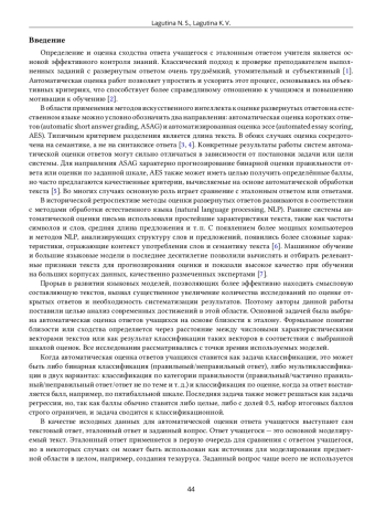 17. O. B. Mishunin, A. P. Savinov, and D. I. Firstov, “Sostoyanie i uroven’ razrabotok sistem avtomaticheskoj ocenki svobodnyh otvetov na estestvennom yazyke,” Modern High Technologies, no. 1, pp. 38-44, 2016.