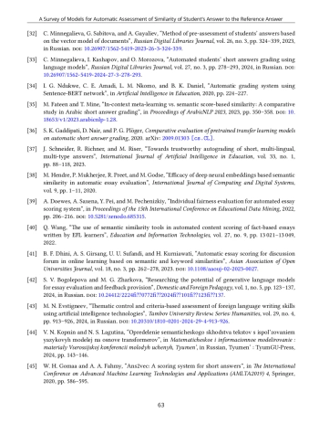 32. C. B. Minnegalieva, G. A. Sabitova, and A. M. Gayaliev, “Method of Pre-Assessment of Students’ Answers Based on the Vector Model of Documents,” Russian Digital Libraries Journal, vol. 26, no. 3, pp. 324-339, 2023, https://doi.org/10.26907/1562-5419-2023-26-3-324-339.