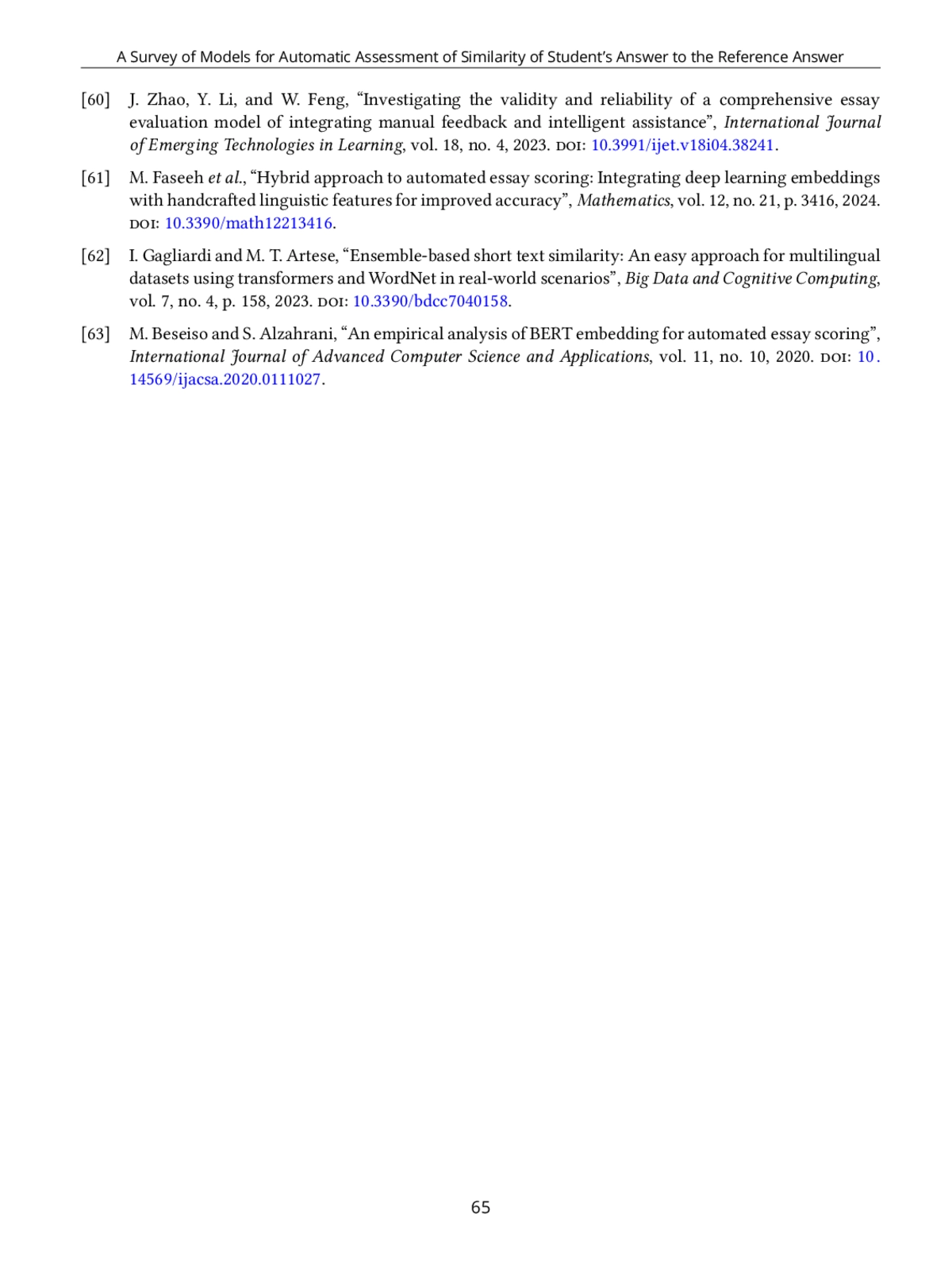 61. M. Faseeh et al., “Hybrid Approach to Automated Essay Scoring: Integrating Deep Learning Embeddings with Handcrafted Linguistic Features for Improved Accuracy,” Mathematics, vol. 12, no. 21, p. 3416, 2024, https://doi.org/10.3390/math12213416.