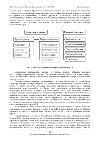 На глобальном уровне все более угрожающе выглядит искусственный интеллект, результаты развития и внедрения которого не могут в полной мере просчитать даже его создатели. Вызывают тревогу опасности биолого-социального характера: инфекционные заболевания людей (единичные и групповые эпидемические вспышки опасных инфекционных заболеваний, эпидемии и пандемии невыявленной этиологии); инфекционные заболевания животных (единичные случаи экзотических и особо опасных инфекционных заболеваний, энзоотия, эпизоотия, панзоотия, инфекционные заболевания сельскохозяйственных животных и водных организмов (гидробионтов) невыявленной этиологии), поражение растений болезнями и вредителями (прогрессирующая эпифитотия, панфитотия, болезни сельскохозяйственных растений невыявленной этиологии, массовое распространение вредителей растений).