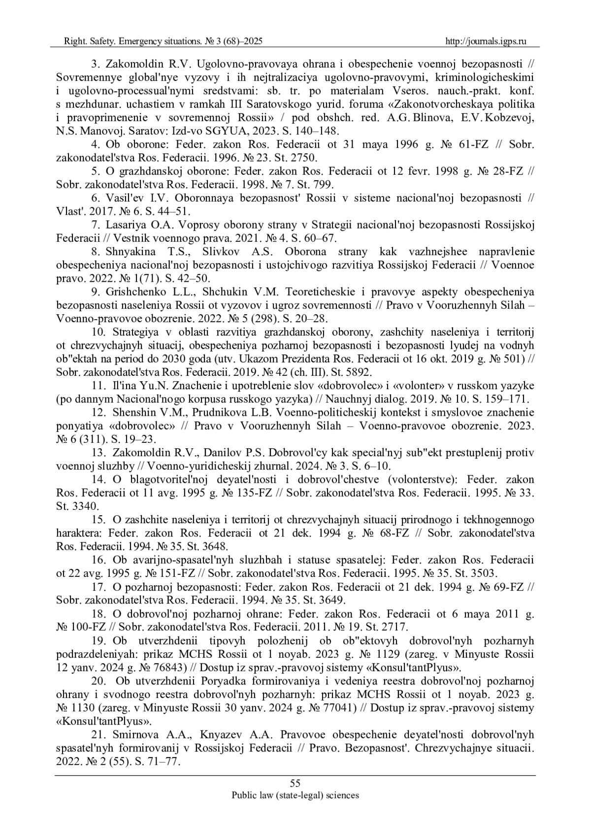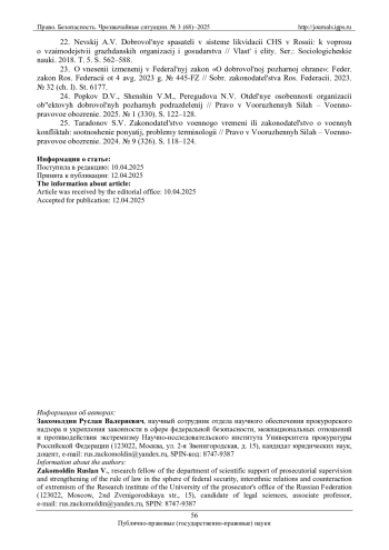 21. Смирнова А.А., Князев А.А. Правовое обеспечение деятельности добровольных спасательных формирований в Российской Федерации // Право. Безопасность. Чрезвычайные ситуации. 2022. № 2 (55). С. 71-77. EDN: WDOVPC