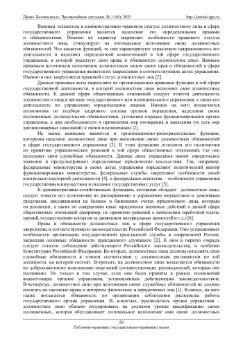 Важным элементом в административно-правовом статусе должностного лица в сфере государственного управления является наделение его определенными правами и обязанностями. Именно их характер закрепляет особенности правового статуса должностного лица, стимулирует на оптимальное исполнение своих должностных обязанностей. Что касается функций, то они характеризуют отраслевую направленность его деятельности и наделяют определенной компетенцией в той сфере государственного управления, в которой реализует свои права и обязанности должностное лицо. Важным правовым источником исполнения должностным лицом своих прав и обязанностей в сфере государственного управления является их закрепление в соответствующих актах управления. Именно в них закрепляется правовой статус должностных лиц [2].