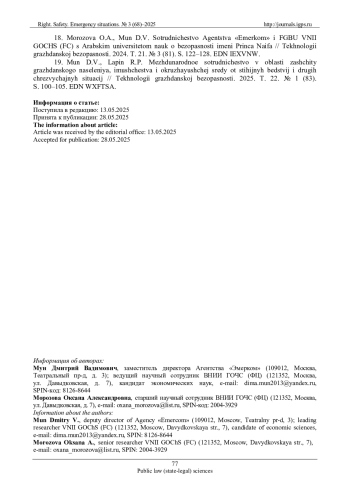 19. Мун Д.В., Лапин Р.П. Международное сотрудничество в области защиты гражданского населения, имущества и окружающей среды от стихийных бедствий и других чрезвычайных ситуаций // Технологии гражданской безопасности. 2025. Т. 22. № 1 (83). С. 100-105. EDN: WXFTSA
