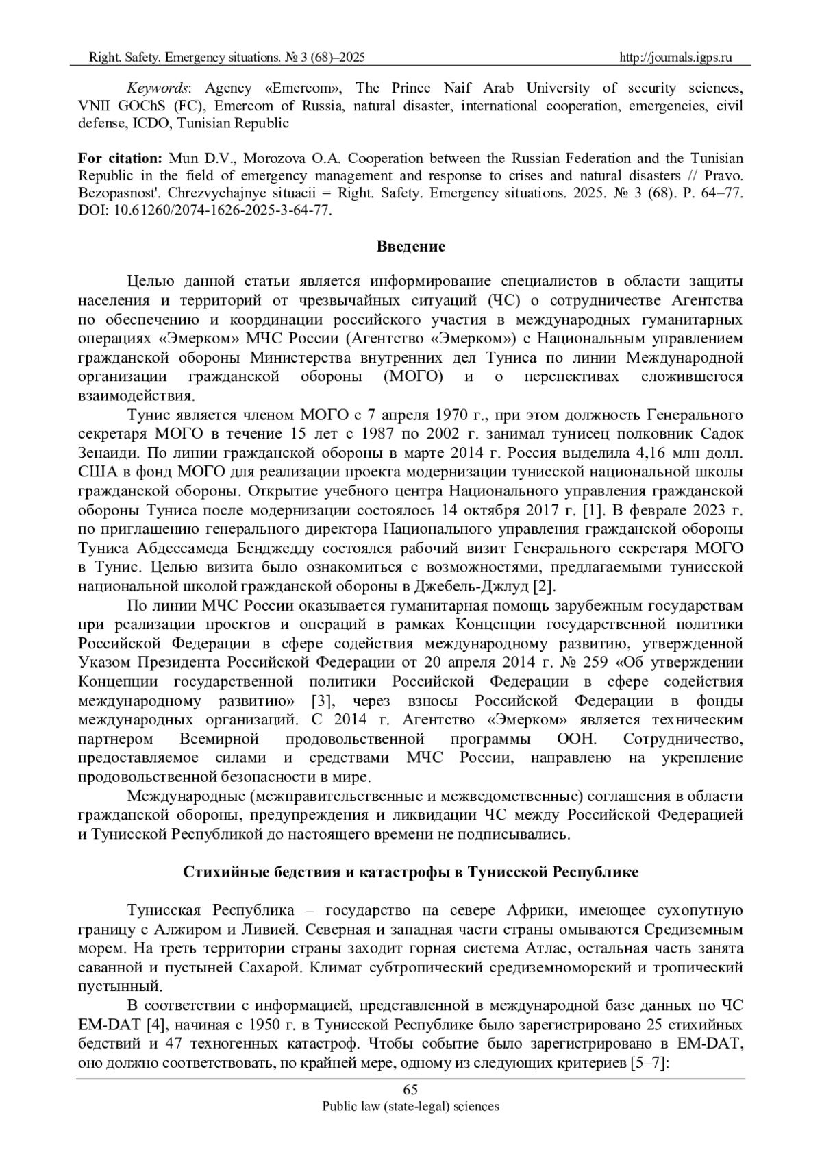 Представлена информация о становлении сотрудничества между Агентством по обеспечению и координации российского участия в международных гуманитарных операциях «Эмерком» МЧС России, ВНИИ ГОЧС (ФЦ) и Национальным управлением гражданской обороны Министерства внутренних дел Туниса по линии Международной организации гражданской обороны. Приведена информация о количестве и динамике стихийных бедствий и катастроф, произошедших на территории Тунисской Республики за последние 75 лет. Представлена информация о прошедшем 18-20 февраля 2025 г. научном симпозиуме по управлению чрезвычайными ситуациями и ликвидации последствий стихийных бедствий, а также об участии Агентства «Эмерком» и ВНИИ ГОЧС (ФЦ) в научном симпозиуме и о перспективах сложившегося взаимодействия.