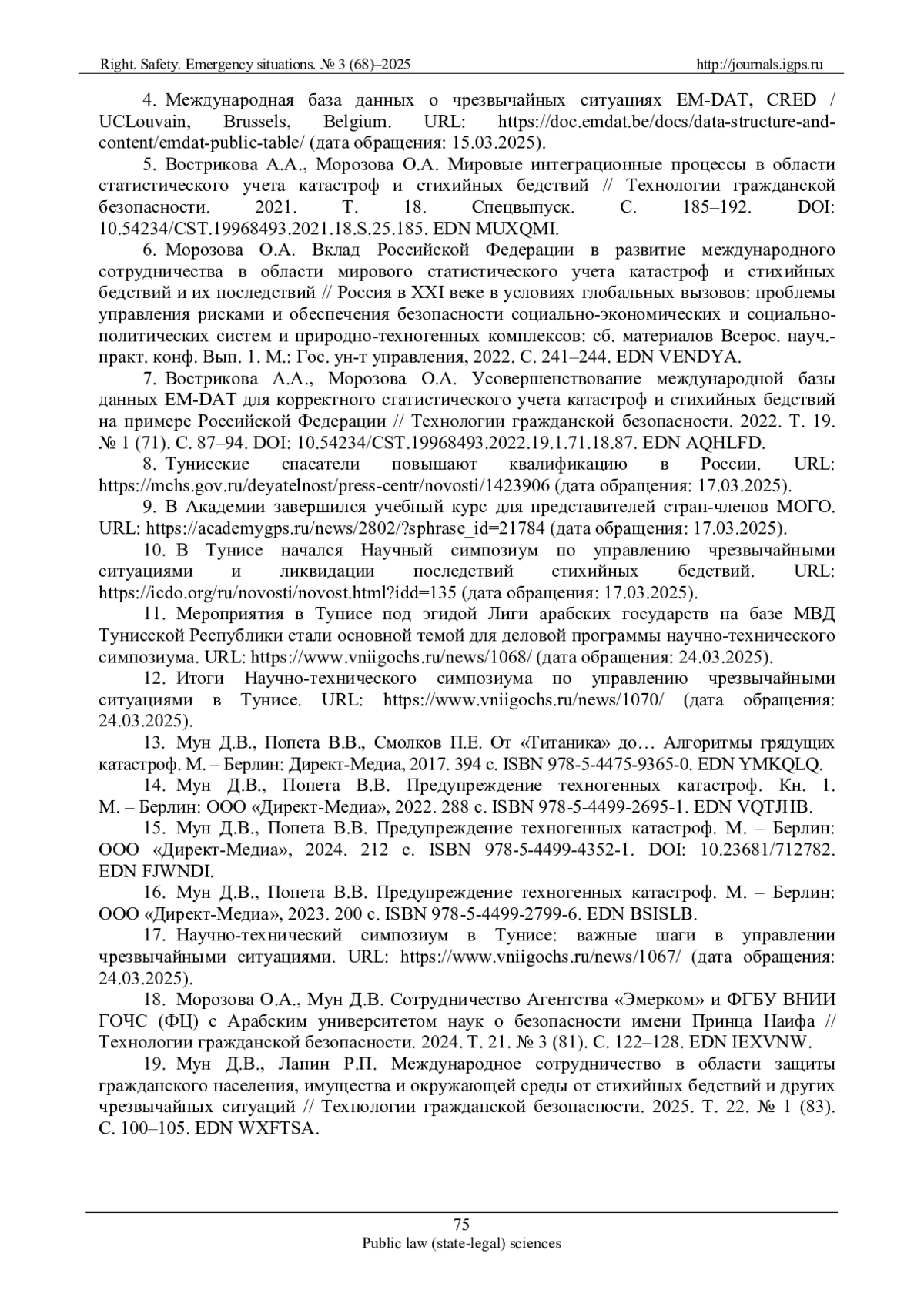 5. Вострикова А.А., Морозова О.А. Мировые интеграционные процессы в области статистического учета катастроф и стихийных бедствий // Технологии гражданской безопасности. 2021. Т. 18. Спецвыпуск. С. 185-192. DOI: 10.54234/CST.19968493.2021.18.S.25.185 EDN: MUXQMI