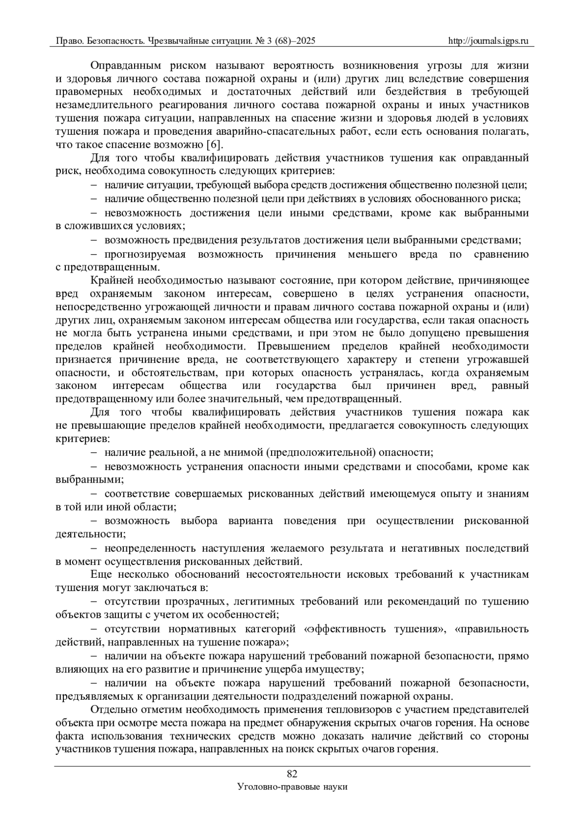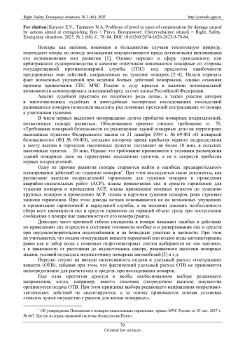 В круг обстоятельств, устанавливаемых при разрешении дел о пожарах в любых процессах (уголовном, административном, гражданском или арбитражном), помимо традиционного выявления механизма возникновения и развития пожара устанавливаются условия, способствовавшие наступлению последствий в виде имущественного ущерба. Палитра этих условий разнообразна и предполагает чаще всего противопожарное состояние объекта до пожара. Однако в последнее время возрастает количество вопросов по анализу действий, направленных на тушение пожара. В рамках статьи будут рассмотрены фактические основания предъявляемых исков к участникам тушения пожара, источники доказательств со стороны истцов, обоснования несостоятельности исковых требований к участникам тушения и рекомендации, направленные на признание действий пожарных обоснованными, допустимыми и необходимыми в конкретных условиях реального пожара.