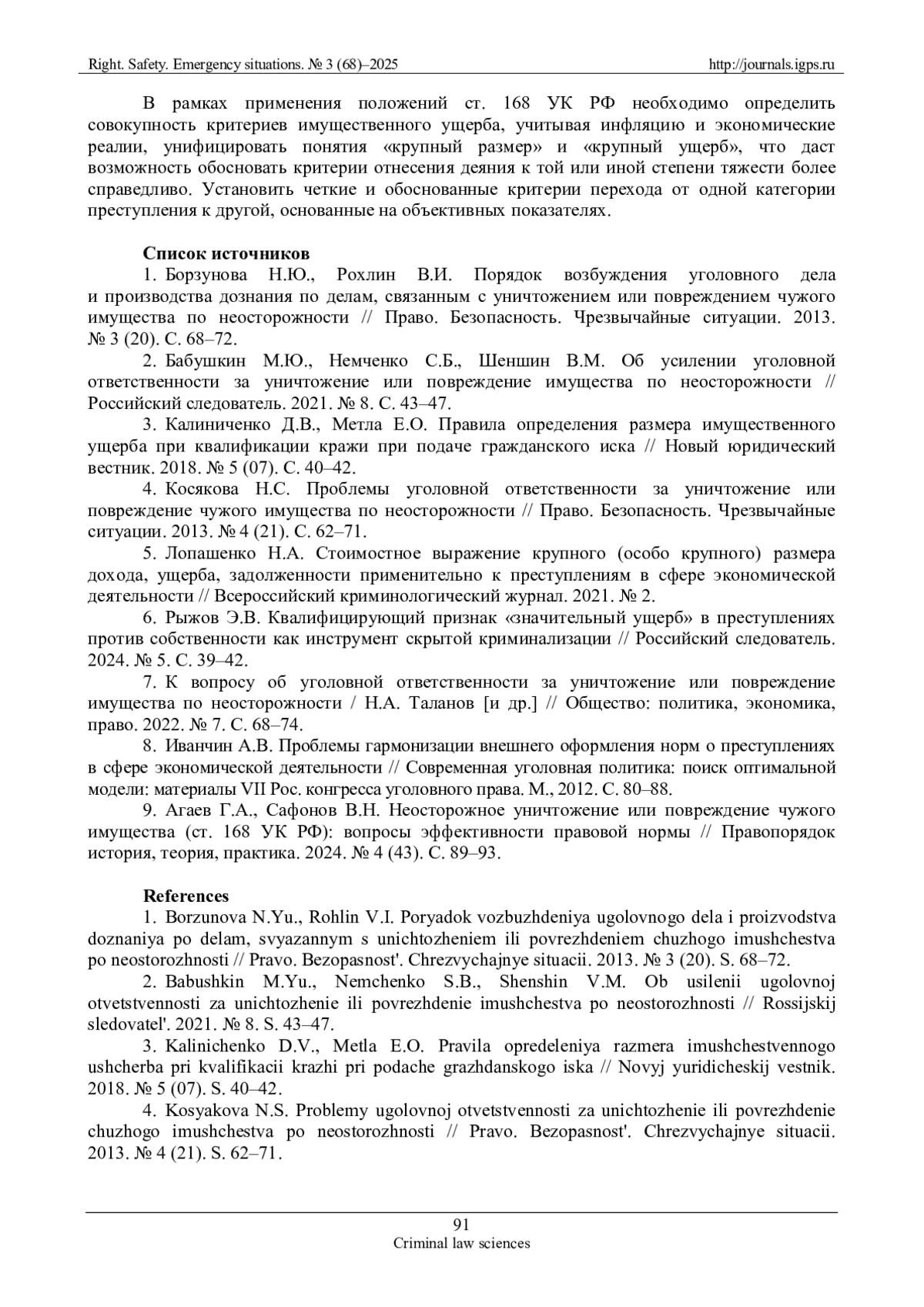 9. Агаев Г.А., Сафонов В.Н. Неосторожное уничтожение или повреждение чужого имущества (ст. 168 УК РФ): вопросы эффективности правовой нормы // Правопорядок история, теория, практика. 2024. № 4 (43). С. 89-93. EDN: DVOBKU