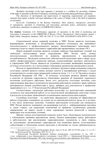 Исследованы правовые вопросы организации системы квалификационной служебной аттестации специалистов в сфере мониторинга и прогнозирования чрезвычайных ситуаций природного и техногенного характера. В этих целях сделан правовой анализ норм Конституции Российской Федерации, трудового права, императивных норм, содержащихся в организационных и регулятивных документах МЧС России. Реализуемая в рамках аттестация работников МЧС России кадровая политика позиционируется как основа кадрового обеспечения функциональной подсистемы мониторинга, лабораторного контроля и прогнозирования чрезвычайных ситуаций единой государственной системы предупреждения и ликвидации чрезвычайных ситуаций. Обязательное владение правовым аппаратом представляется как условие недопущения при проведении аттестации нарушения прав специалистов в сфере мониторинга и прогнозирования чрезвычайных ситуаций. Представлены направления развития и совершенствования обеспечивающих организационных и нормативных сегментов, требующих научно-юридического переосмысления в ходе дальнейшей работы в сфере регулирования.