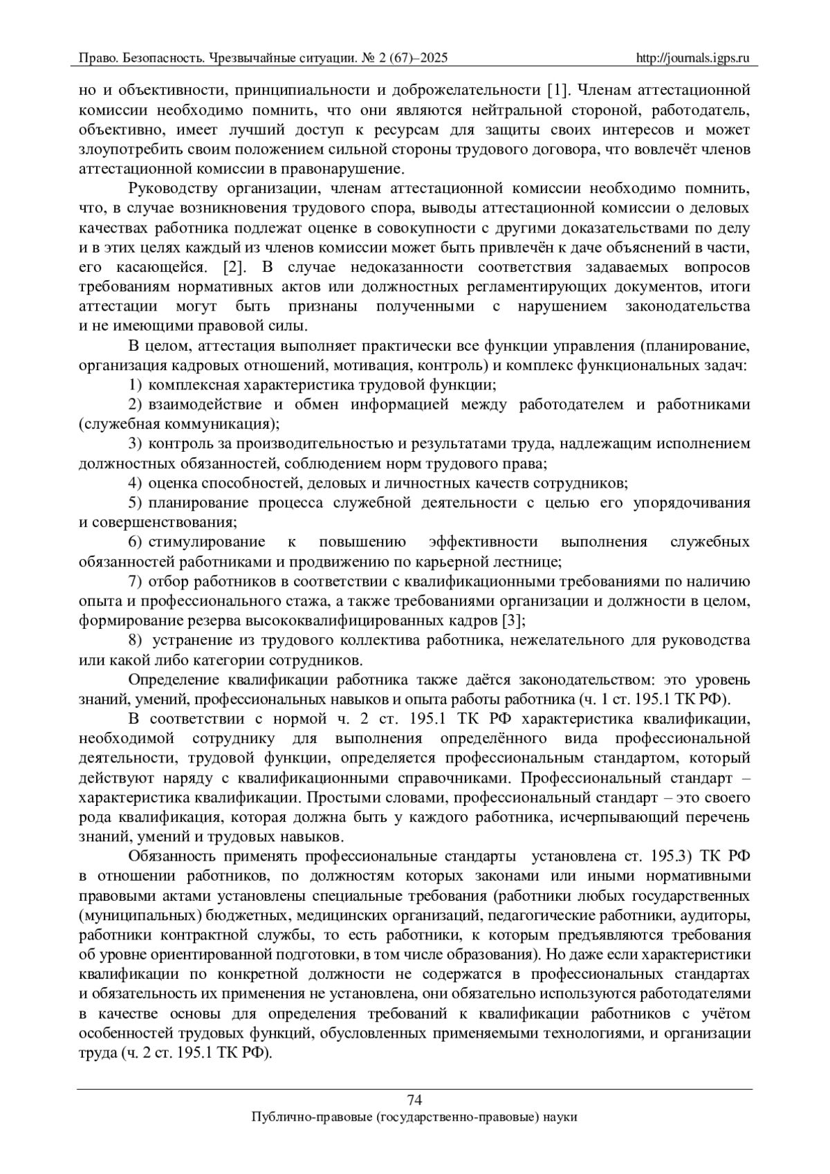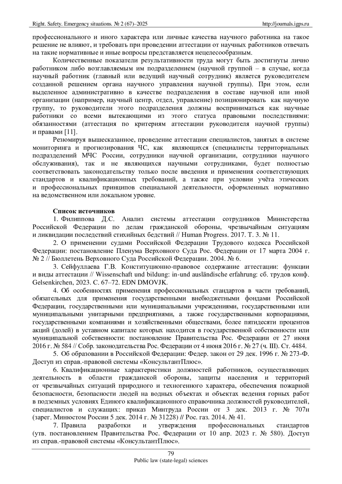 1. Филиппова Д.С. Анализ системы аттестации сотрудников Министерства Российской Федерации по делам гражданской обороны, чрезвычайным ситуациям и ликвидации последствий стихийных бедствий // Human Рrogress. 2017. Т. 3. № 11.