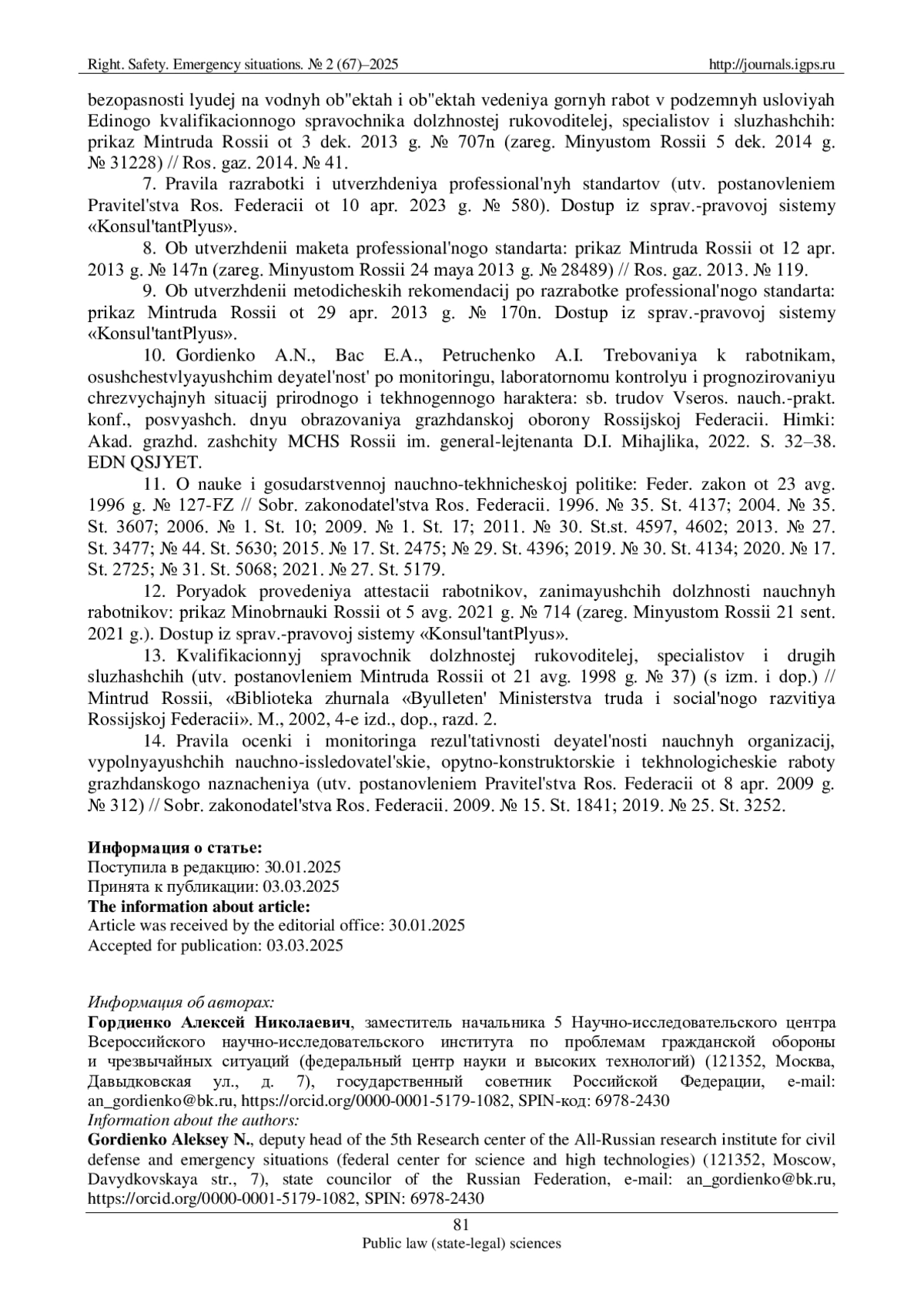 10. Гордиенко А.Н., Бац Е.А., Петрученко А.И. Требования к работникам, осуществляющим деятельность по мониторингу, лабораторному контролю и прогнозированию чрезвычайных ситуаций природного и техногенного характера: сб. трудов Всерос. науч.-практ. конф., посвящ. дню образования гражданской обороны Российской Федерации. Химки: Акад. гражд. защиты МЧС России им. генерал-лейтенанта Д.И. Михайлика, 2022. С. 32-38. EDN: QSJYET