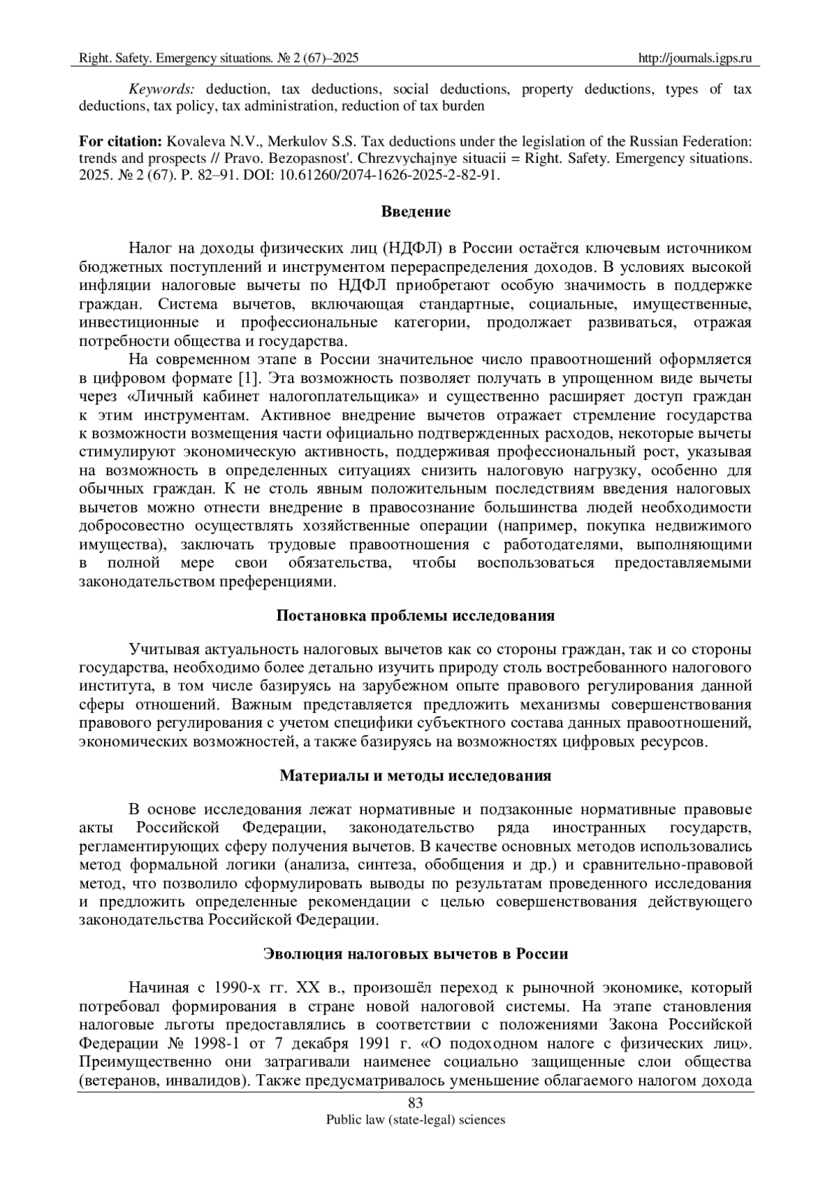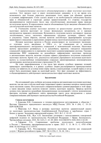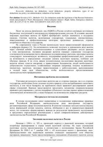 На современном этапе в России значительное число правоотношений оформляется в цифровом формате [1]. Эта возможность позволяет получать в упрощенном виде вычеты через «Личный кабинет налогоплательщика» и существенно расширяет доступ граждан к этим инструментам. Активное внедрение вычетов отражает стремление государства к возможности возмещения части официально подтвержденных расходов, некоторые вычеты стимулируют экономическую активность, поддерживая профессиональный рост, указывая на возможность в определенных ситуациях снизить налоговую нагрузку, особенно для обычных граждан. К не столь явным положительным последствиям введения налоговых вычетов можно отнести внедрение в правосознание большинства людей необходимости добросовестно осуществлять хозяйственные операции (например, покупка недвижимого имущества), заключать трудовые правоотношения с работодателями, выполняющими в полной мере свои обязательства, чтобы воспользоваться предоставляемыми законодательством преференциями.