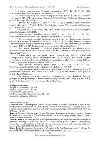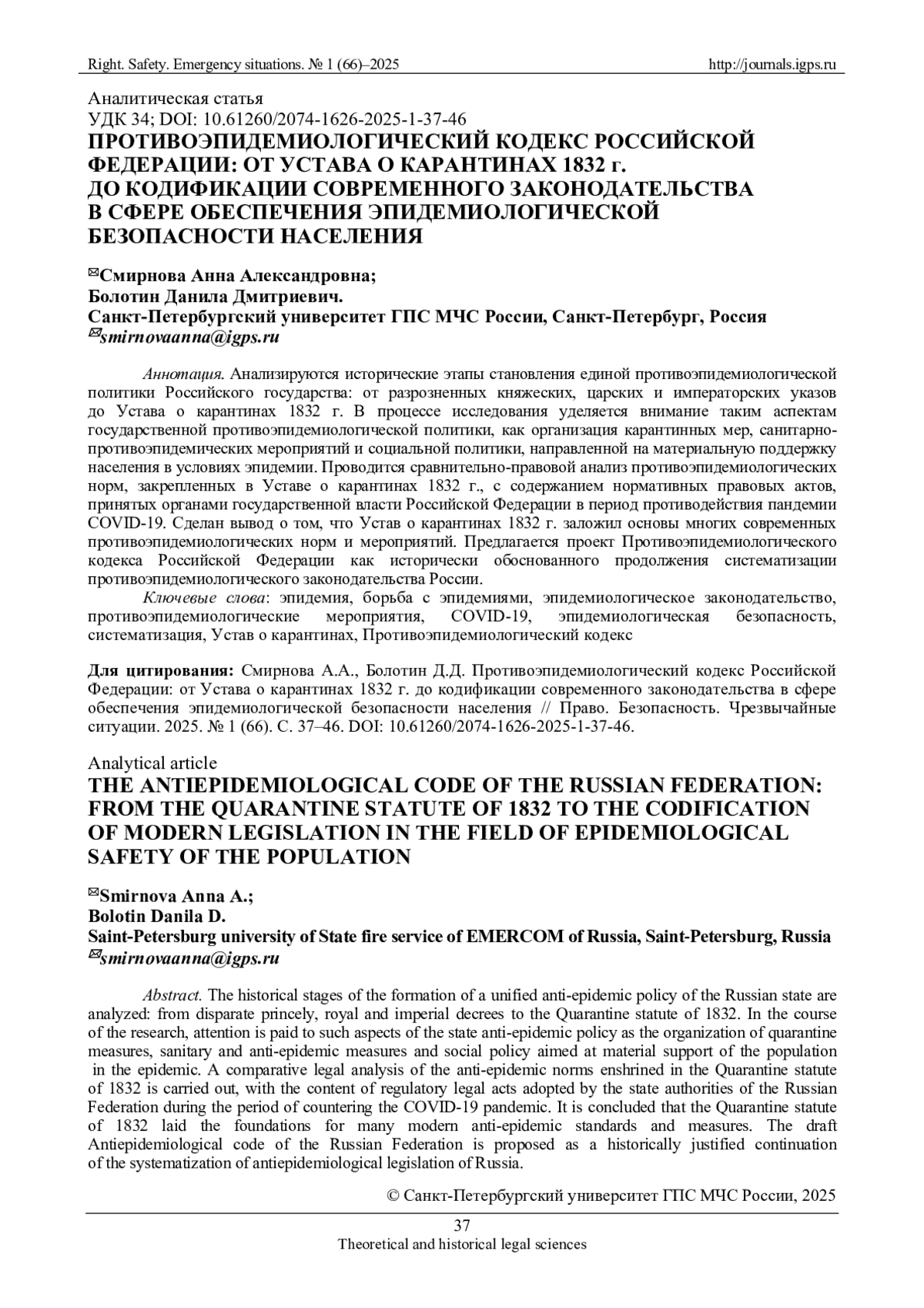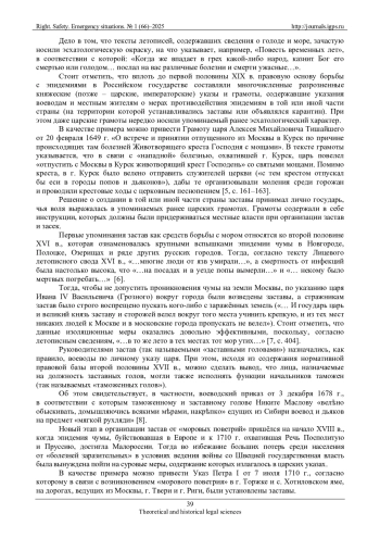 Анализируются исторические этапы становления единой противоэпидемиологической политики Российского государства: от разрозненных княжеских, царских и императорских указов до Устава о карантинах 1832 г. В процессе исследования уделяется внимание таким аспектам государственной противоэпидемиологической политики, как организация карантинных мер, санитарно-противоэпидемических мероприятий и социальной политики, направленной на материальную поддержку населения в условиях эпидемии. Проводится сравнительно-правовой анализ противоэпидемиологических норм, закрепленных в Уставе о карантинах 1832 г., с содержанием нормативных правовых актов, принятых органами государственной власти Российской Федерации в период противодействия пандемии COVID-19. Сделан вывод о том, что Устав о карантинах 1832 г. заложил основы многих современных противоэпидемиологических норм и мероприятий. Предлагается проект Противоэпидемиологического кодекса Российской Федерации как исторически обоснованного продолжения систематизации противоэпидемиологического законодательства России.