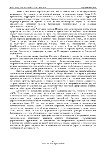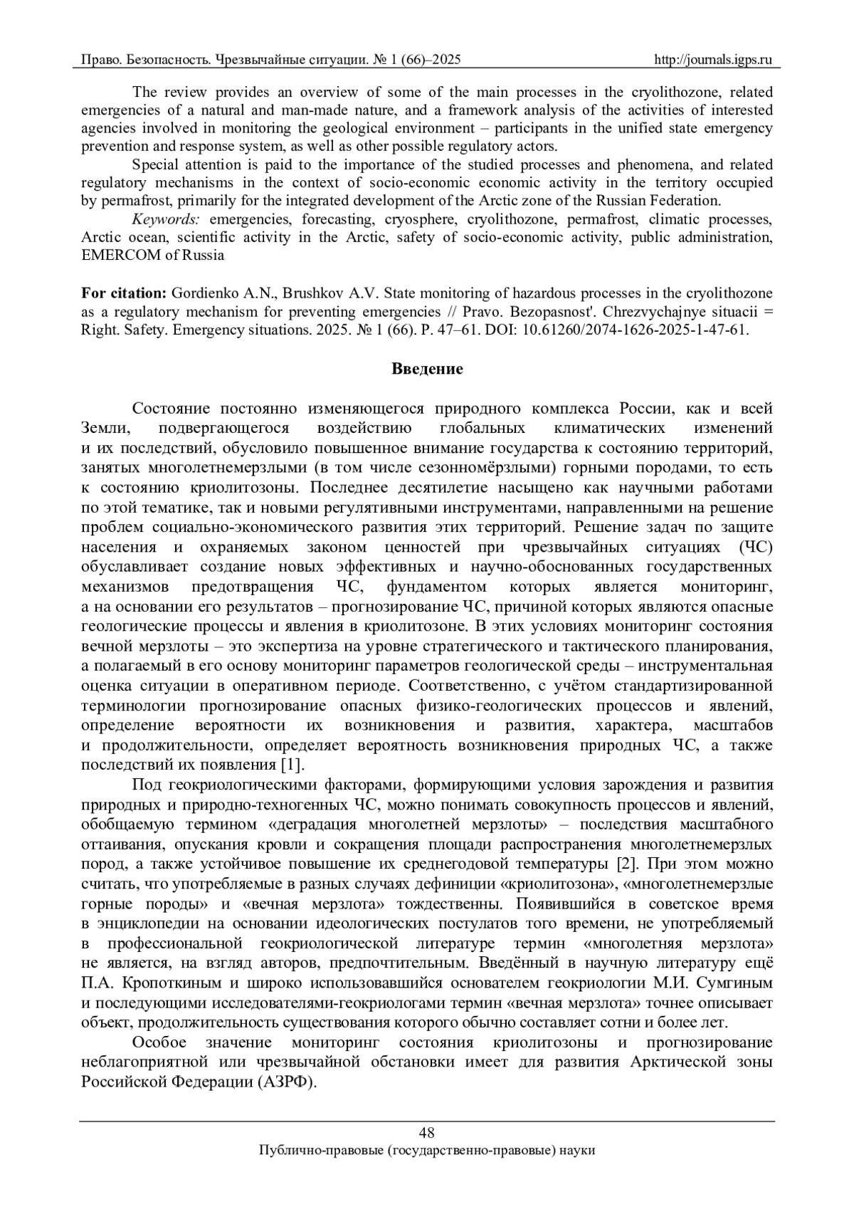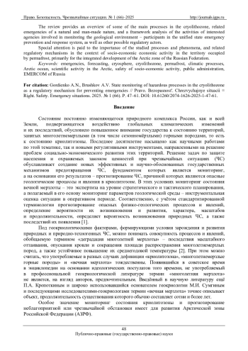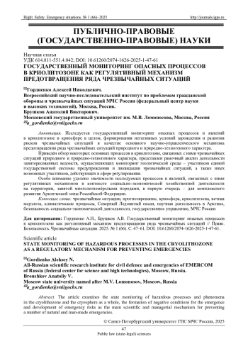 Исследуется государственный мониторинг опасных процессов и явлений в криолитозоне и криосфере в целом, формирования негативных условий зарождения и развития рисков чрезвычайных ситуаций в качестве основного научно-управленческого механизма предотвращения ряда чрезвычайных ситуаций природного и природно-техногенного характера. Приведён обзор некоторых основных процессов в криолитозоне, связанных с ними чрезвычайных ситуаций природного и природно-техногенного характера, представлен рамочный анализ деятельности заинтересованных ведомств, осуществляющих мониторинг геологической среды - участников единой государственной системы предупреждения и ликвидации чрезвычайных ситуаций, а также иных возможных участников, действующих в сфере регулирования. Особе внимание уделено значимости исследуемых процессов и явлений, связанных с ними регулятивных механизмов в контексте социально-экономической хозяйственной деятельности на территории, занятой многолетнемёрзлыми породами, в первую очередь - для комплексного развития Арктической зоны Российской Федерации.