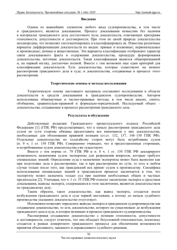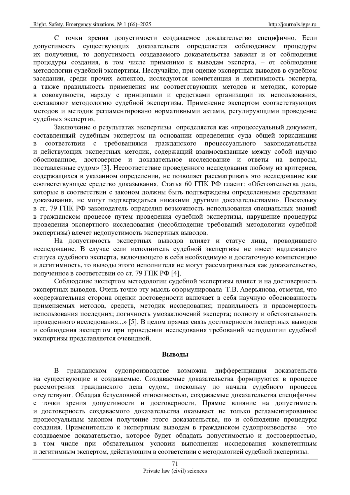 В гражданском судопроизводстве возможна дифференциация доказательств на существующие до начала судебного производства и создаваемые после возбуждения гражданского дела в суде. К числу последних, например, относятся выводы судебного эксперта. Создаваемые доказательства обладают определенной спецификой: они, безусловно, являются относимыми, а их допустимость и достоверность, кроме прочих факторов, зависит от соблюдения процедуры их создания. Применительно к выводам эксперта можно утверждать, что они будут допустимыми и достоверными, в том числе при условии проведения исследования компетентным и легитимным экспертом, который строго придерживается методологии судебной экспертизы.