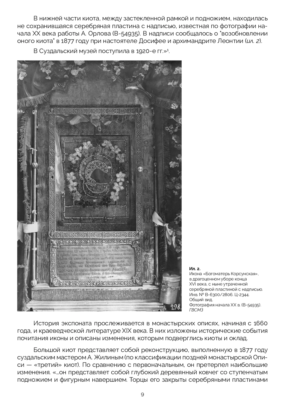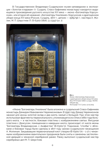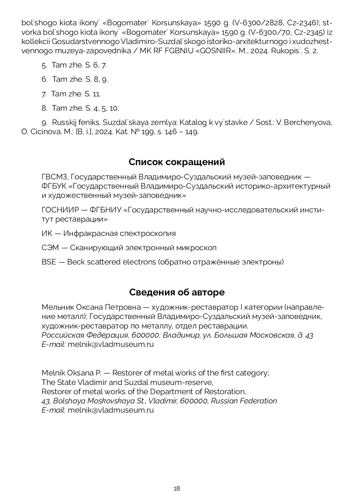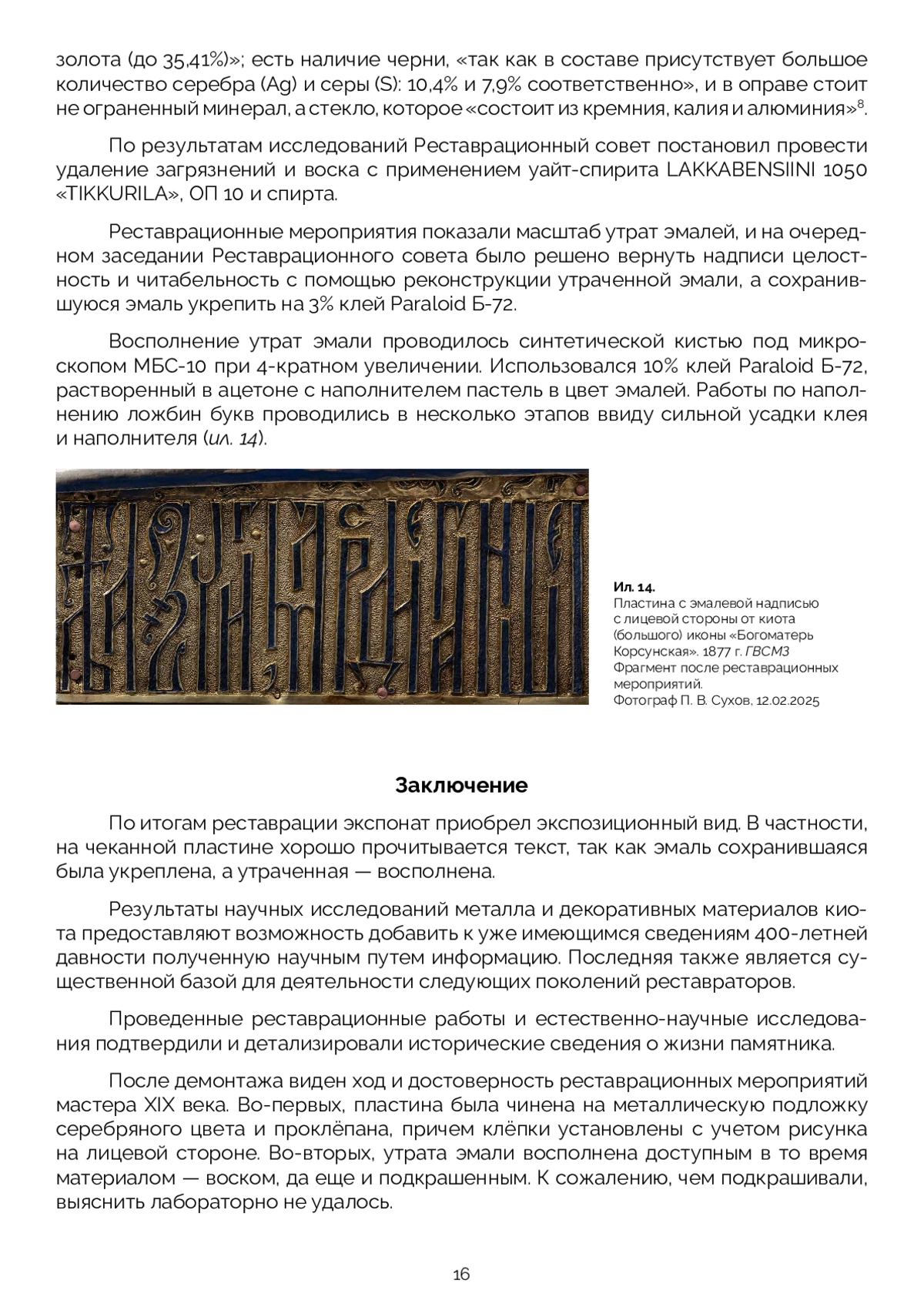 Статья посвящена реставрации киота (большого) иконы «Богоматерь Корсунская» с инвентарным номером В-6300/2806, в частности, детали — чеканной полосе с надписью, украшенной эмалью синего цвета. Убранство иконы «Богоматерь Корсунская» за свою многолетнюю историю претерпело существенные изменения в окладе и киотах, что отражено в письменных источниках. В 2024 году большой киот был взят на реставрацию. После демонтажа металла с деревянной основы появилось представление о состоянии металла (старый — новый). Данная информация позволила соотнести исторические сведения о ранних реставрационных вмешательствах с реальным видом металла и убедиться в достоверности сведений. Для более глубокого изучения памятника было проведено исследование металла и декоративных материалов в Государственном научно-исследовательском институте реставрации. Мы предлагаем подробно рассмотреть деталь убранства киота — чеканную полосу, а конкретно — вкладную надпись. До недавнего времени полосе не уделяли должного внимания, все источники сообщали лишь о том, что вязь чеканена на конфаренном фоне. Однако при внимательном рассмотрении оказалось, что буквы украшены эмалью темно-синего цвета, хотя из-за сильных загрязнений они были не видны. После проведения общего демонтажа металла киота мы смогли отдельно изучить чеканную полосу, ее лицевую и оборотную стороны — как визуально, так и с помощью специального оборудования. По результатам исследований был разработан план реставрационных мероприятий, по которому были выполнены реставрационные работы. Естественно-научные исследования, проведенные на профессиональном оборудовании в специализированном учреждении, и их результаты пополняют информационную базу предмета и заметно облегчают составление плана выполнения дальнейших работ.