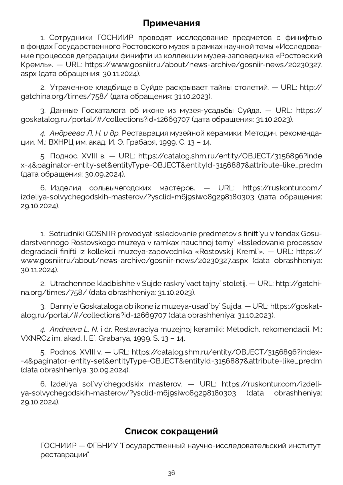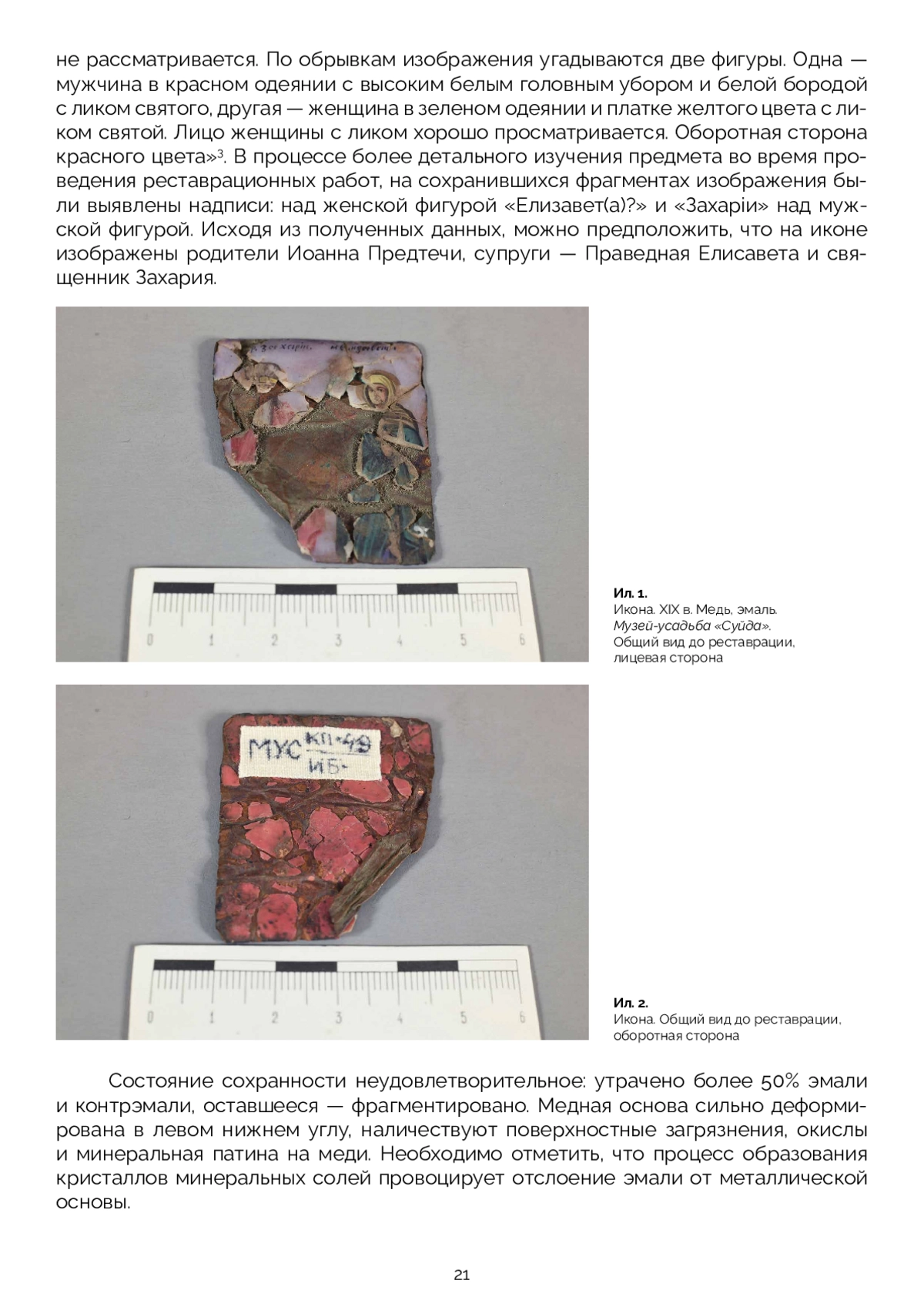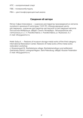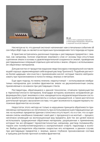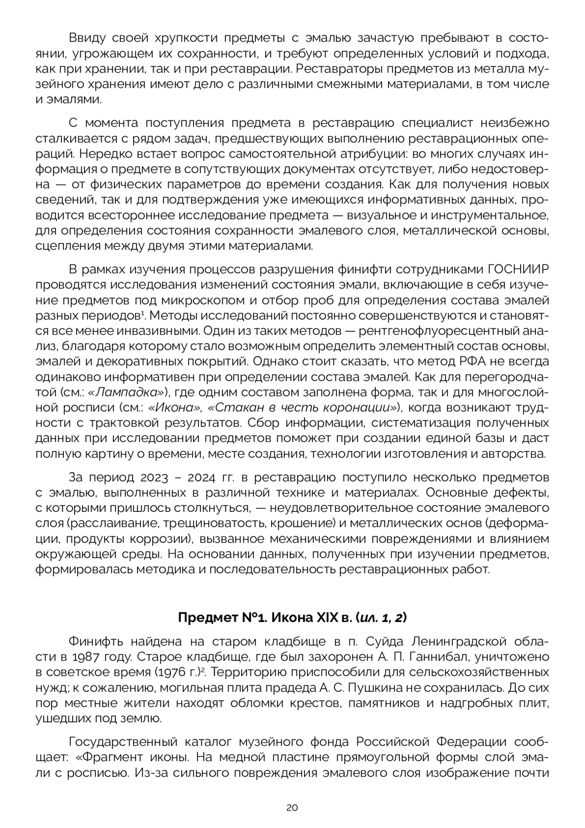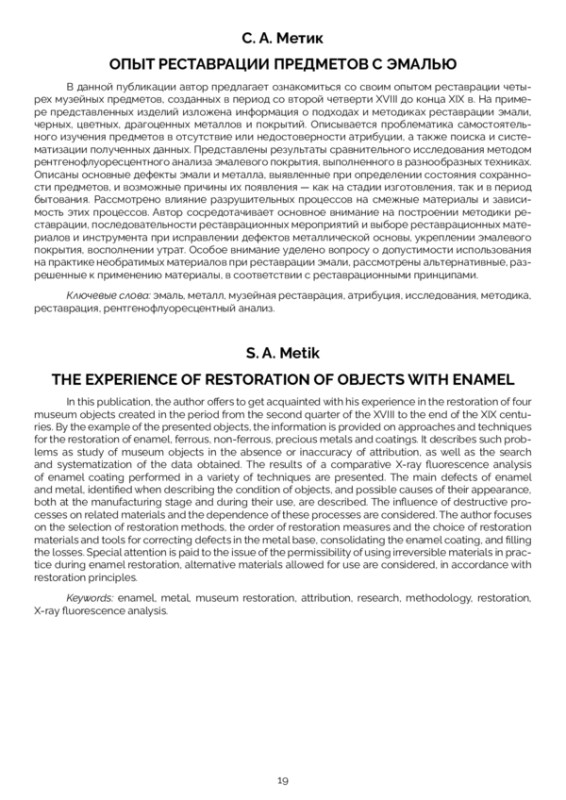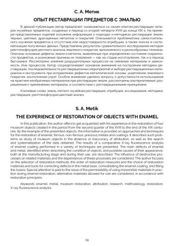 В данной публикации автор предлагает ознакомиться со своим опытом реставрации четырех музейных предметов, созданных в период со второй четверти XVIII до конца XIX в. На примере представленных изделий изложена информация о подходах и методиках реставрации эмали, черных, цветных, драгоценных металлов и покрытий. Описывается проблематика самостоятельного изучения предметов в отсутствие или недостоверности атрибуции, а также поиска и систематизации полученных данных. Представлены результаты сравнительного исследования методом рентгенофлуоресцентного анализа эмалевого покрытия, выполненного в разнообразных техниках. Описаны основные дефекты эмали и металла, выявленные при определении состояния сохранности предметов, и возможные причины их появления - как на стадии изготовления, так и в период бытования. Рассмотрено влияние разрушительных процессов на смежные материалы и зависимость этих процессов. Автор сосредотачивает основное внимание на построении методики реставрации, последовательности реставрационных мероприятий и выборе реставрационных материалов и инструмента при исправлении дефектов металлической основы, укреплении эмалевого покрытия, восполнении утрат. Особое внимание уделено вопросу о допустимости использования на практике необратимых материалов при реставрации эмали, рассмотрены альтернативные, разрешенные к применению материалы, в соответствии с реставрационными принципами.