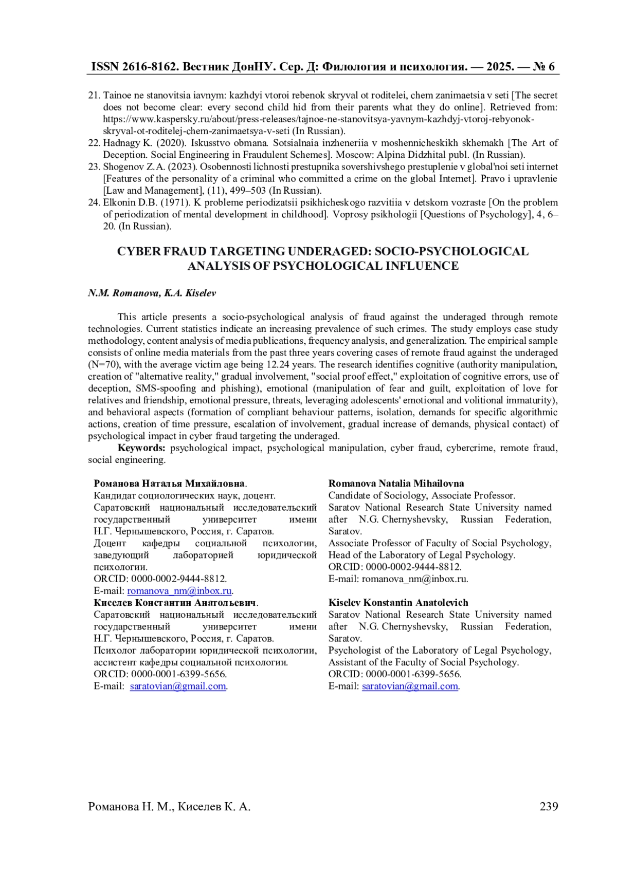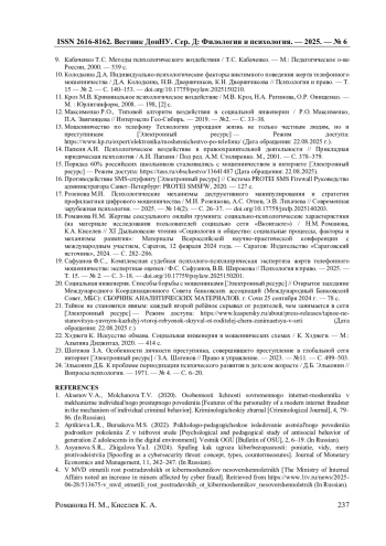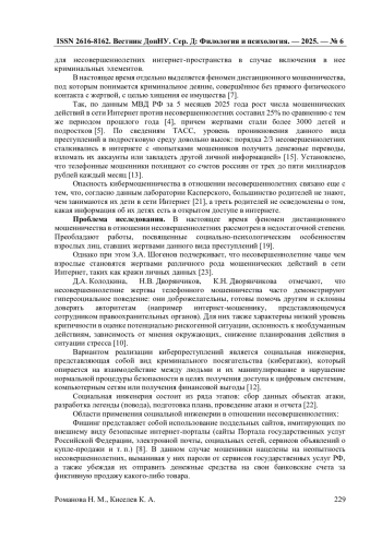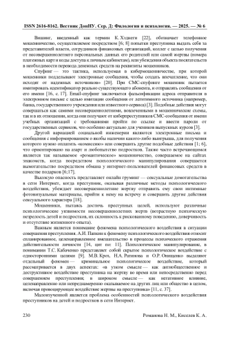 18. Романова Н.М. Жертвы сексуального онлайн груминга: социально-психологические характеристики (на материале исследования пользователей социально сети “Вконтакте”) / Н.М. Романова, К.А. Киселев // XI Дыльновские чтения “Социология и общество: социальные процессы, факторы и механизмы развития”: Материалы Всероссийской научно-практической конференции с международным участием, Саратов, 12 февраля 2024 года. - Саратов: Издательство “Саратовский источник”, 2024. - С. 282-286.