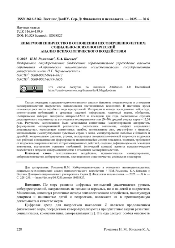 Результаты исследования: были установлены когнитивные (манипулирование авторитетом, формирование «альтернативной реальности», постепенное вовлечение, «эффект социального доказательства», эксплуатация когнитивных ошибок, использование лжи, смс-спуфинг и фишинг), эмоциональные (манипулирование чувствами страха и вины, манипулирование любовью к ближним и дружбой, эмоциональное давление, угрозы, эксплуатация эмоционально-волевой незрелости подростка или ребенка) и поведенческие (формирование подчиняющейся модели поведения, изоляция, требование от подростка совершения четких алгоритмизированных действий, создание дефицита времени, эскалация вовлечения, постепенное усиление требований, физический контакт) аспекты психологического воздействия в ситуации кибермошенничества в отношении несовершеннолетних.