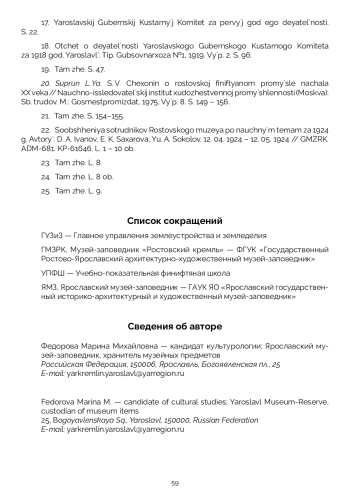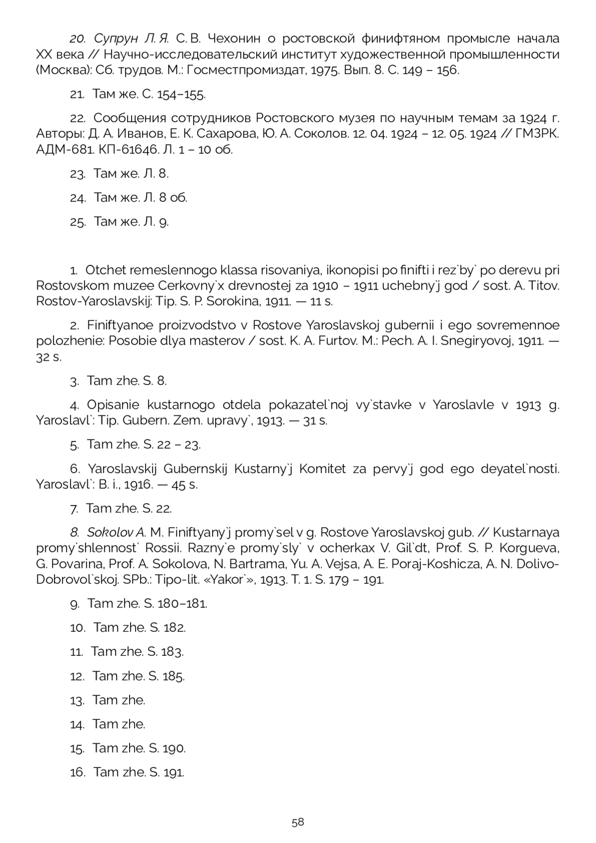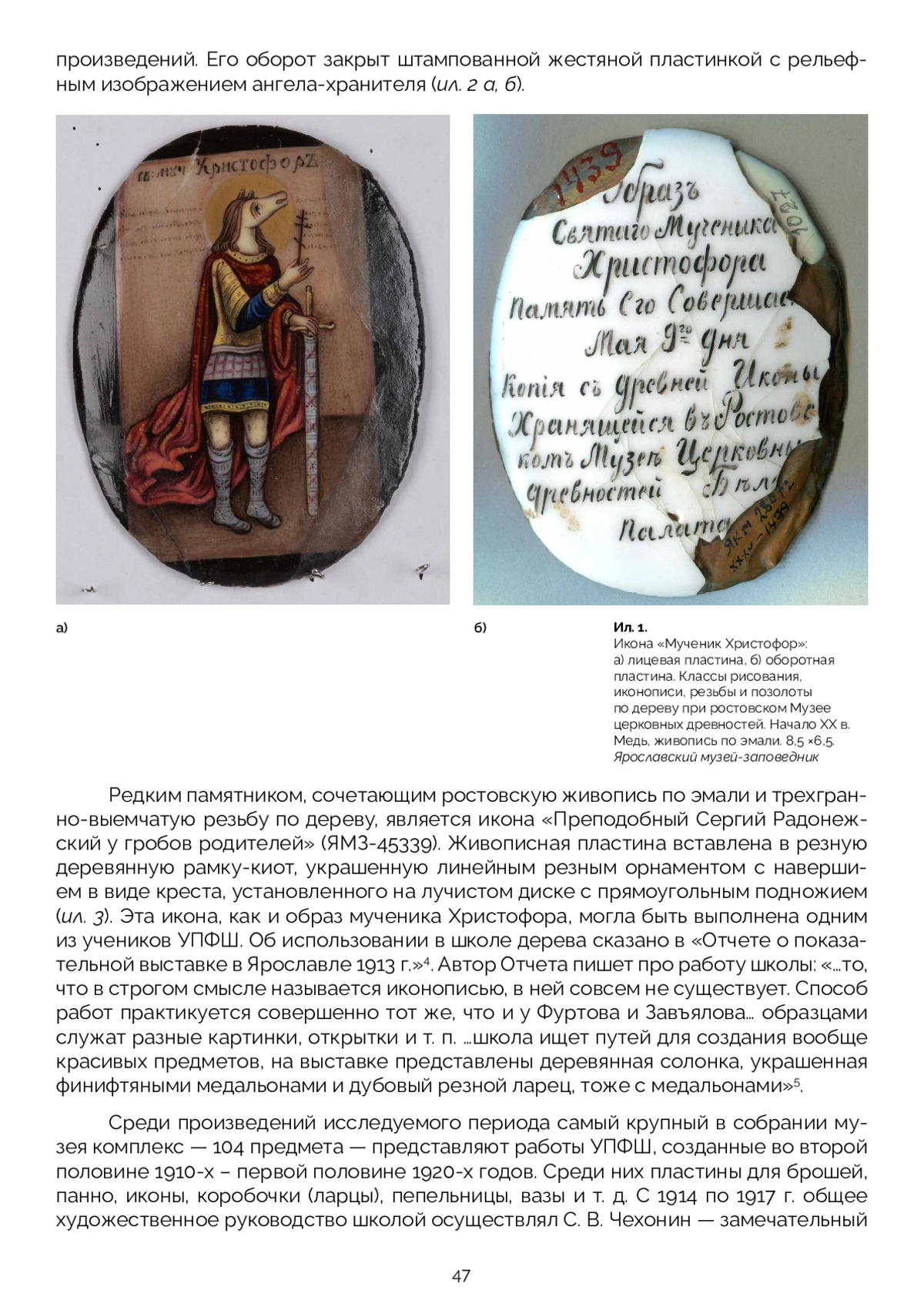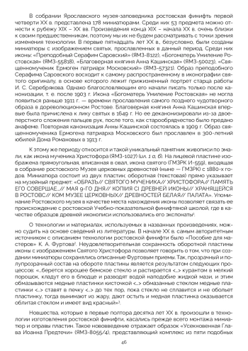 В статье рассматриваются вопросы изменения в первой четверти XX века технологии и использованных материалов в художественном промысле ростовская финифть. Предметом исследования являются произведения живописи по эмали этого периода из собрания Ярославского музея -заповедника, а также современные им источники и литература. В статье отражена деятельность органов государственной и местной власти, направленная на сохранение промысла. Особое внимание в статье уделено работе в промысле специалистов по керамике — деятельности технолога А. М. Соколова и художника С. В. Чехонина. Профессор Санкт-Петербургского практического технологического института А. М. Соколов изучил используемые в промысле технологии, оборудование и материалы. Он предложил разработать эмалевый грунт для живописи и организовать в Ростове учебно-показательную мастерскую, которая бы имела специальные печи для обжига эмали и снабжала мастеров промысла необходимыми материалами. Созданной в 1912 г. Учебно-показательной финифтяной школой с 1914 по 1917 г. по назначению Министерства Земледелия руководил С. В. Чехонин. Результатом его деятельности стали произведения учеников школы, представленные в статье. На основе опубликованных отчетов, составленных заинтересованными в проблеме лицами, и визуального анализа произведений, выполненных учениками ростовской учебно-показательной финифтяной школы, делаются предварительные выводы об изменениях в технологии и материалах, произошедших в промысле в конце десятых — начале двадцатых годов XX века.