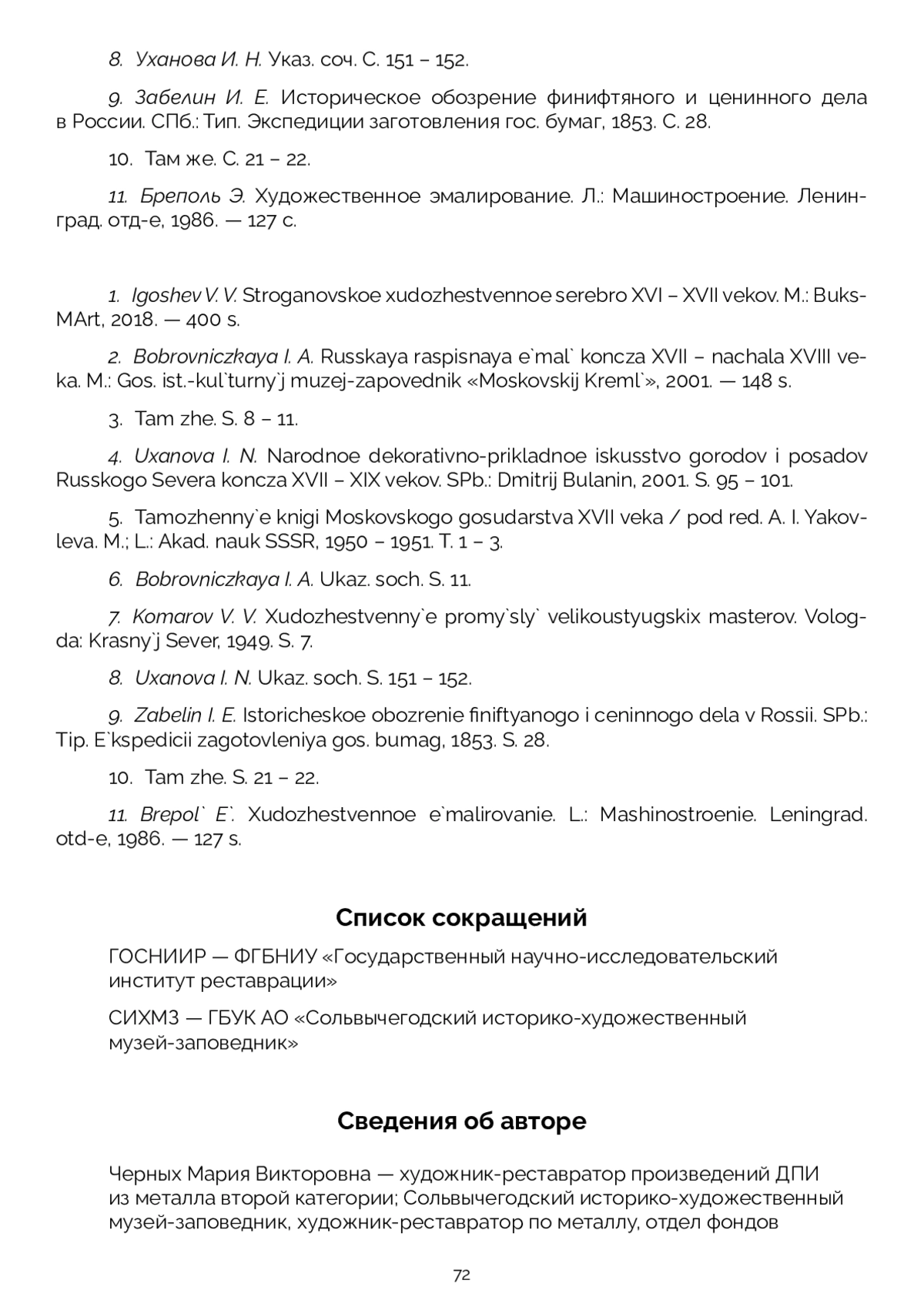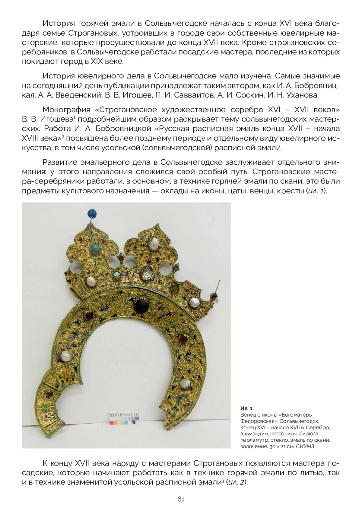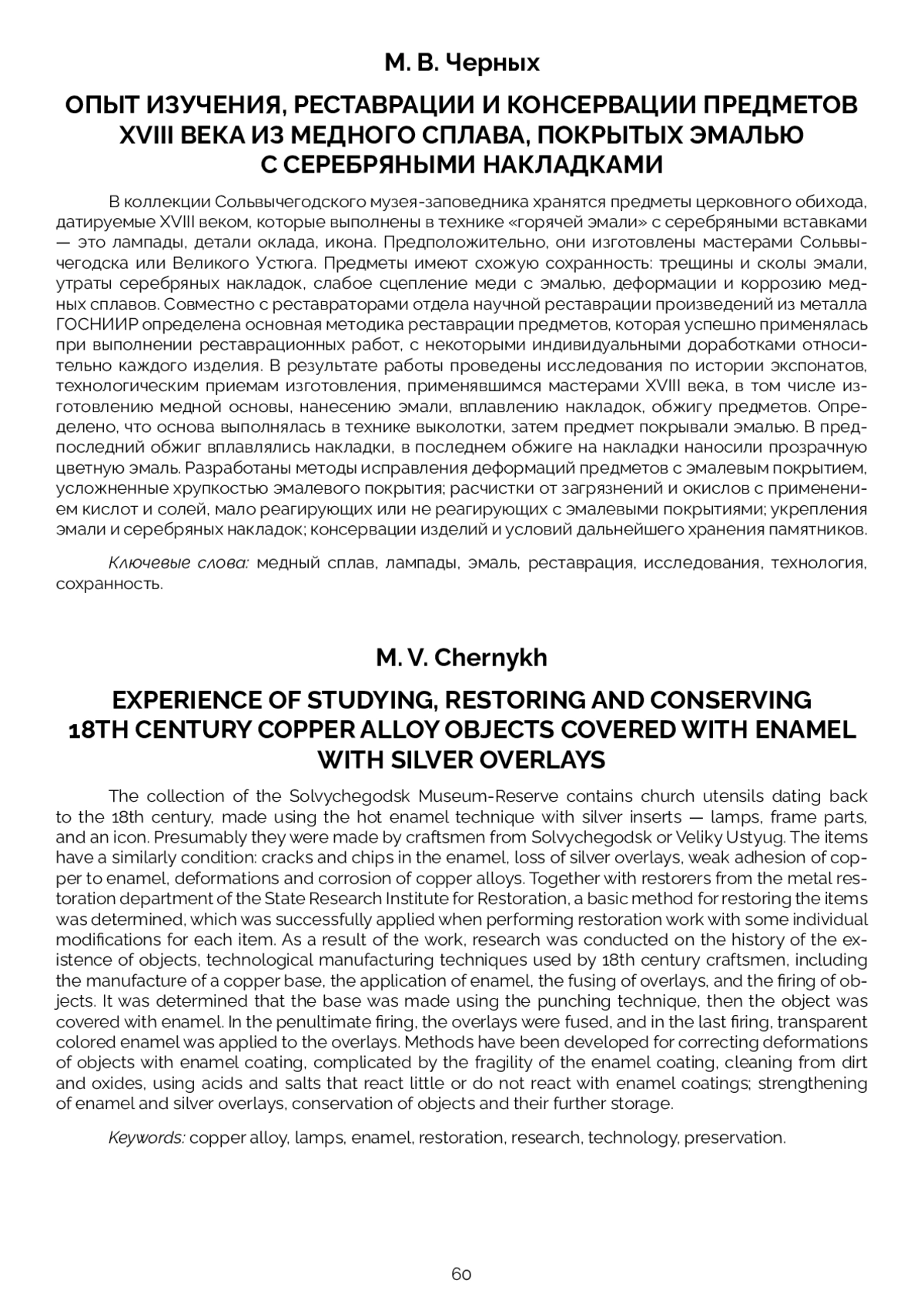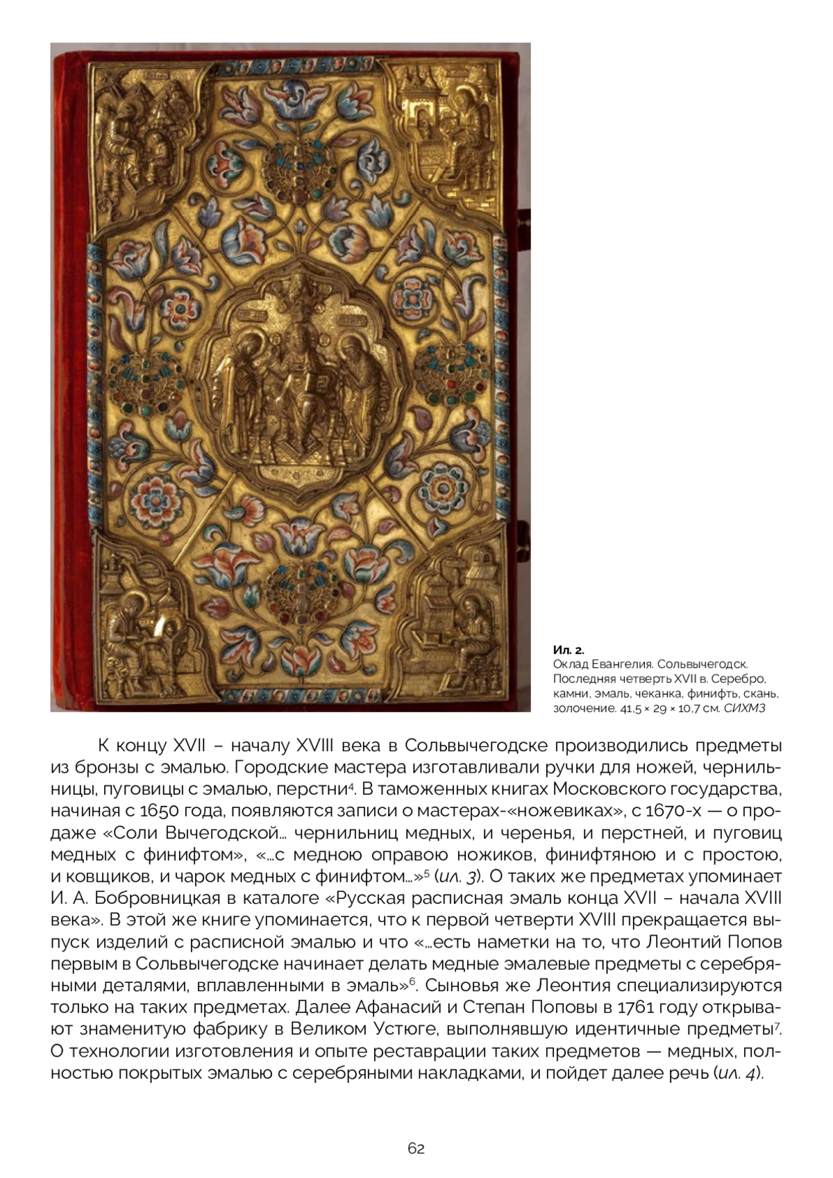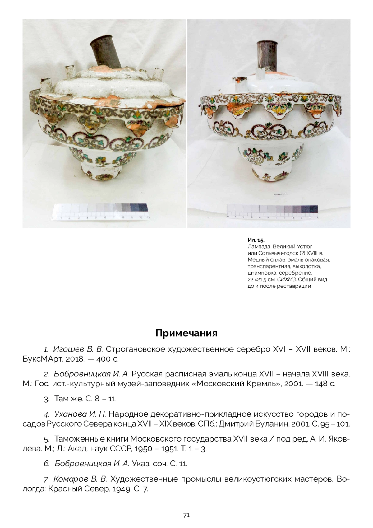 В коллекции Сольвычегодского музея-заповедника хранятся предметы церковного обихода, датируемые XVIII веком, которые выполнены в технике «горячей эмали» с серебряными вставками — это лампады, детали оклада, икона. Предположительно, они изготовлены мастерами Сольвычегодска или Великого Устюга. Предметы имеют схожую сохранность: трещины и сколы эмали, утраты серебряных накладок, слабое сцепление меди с эмалью, деформации и коррозию медных сплавов. Совместно с реставраторами отдела научной реставрации произведений из металла ГОСНИИР определена основная методика реставрации предметов, которая успешно применялась при выполнении реставрационных работ, с некоторыми индивидуальными доработками относительно каждого изделия. В результате работы проведены исследования по истории экспонатов, технологическим приемам изготовления, применявшимся мастерами XVIII века, в том числе изготовлению медной основы, нанесению эмали, вплавлению накладок, обжигу предметов. Определено, что основа выполнялась в технике выколотки, затем предмет покрывали эмалью. В предпоследний обжиг вплавлялись накладки, в последнем обжиге на накладки наносили прозрачную цветную эмаль. Разработаны методы исправления деформаций предметов с эмалевым покрытием, усложненные хрупкостью эмалевого покрытия; расчистки от загрязнений и окислов с применением кислот и солей, мало реагирующих или не реагирующих с эмалевыми покрытиями; укрепления эмали и серебряных накладок; консервации изделий и условий дальнейшего хранения памятников.