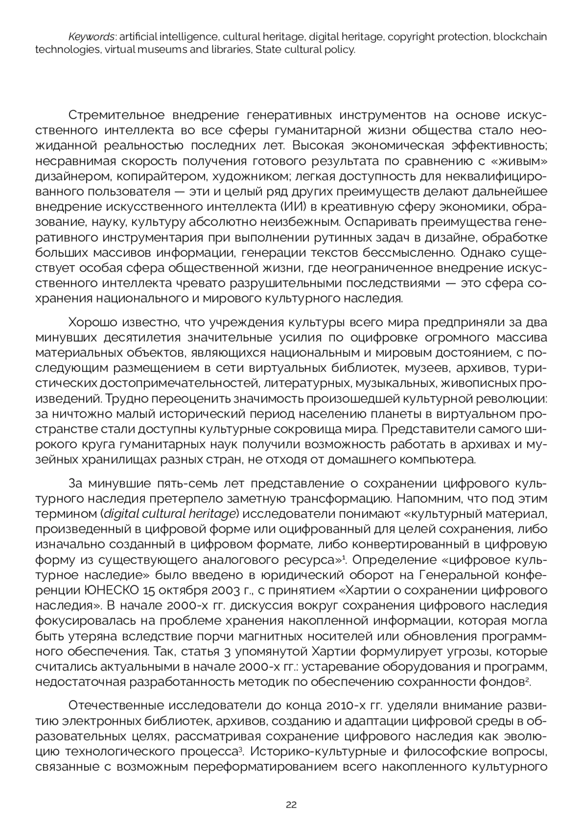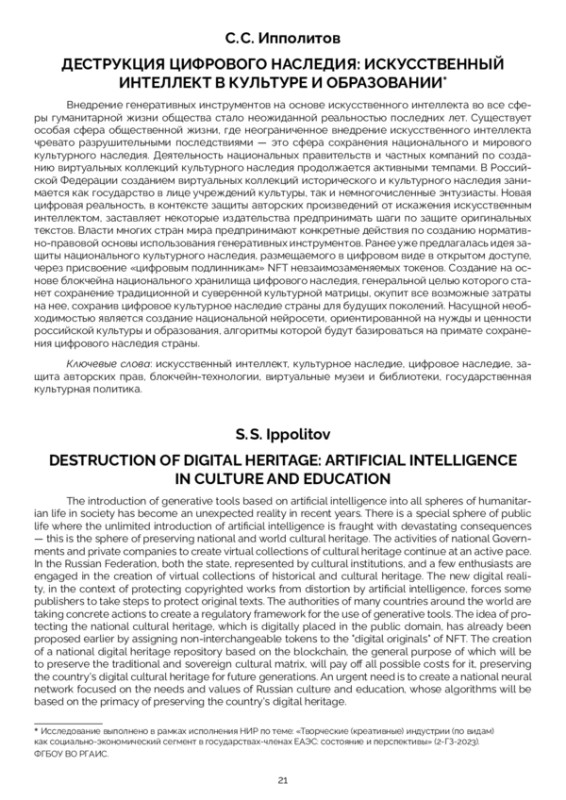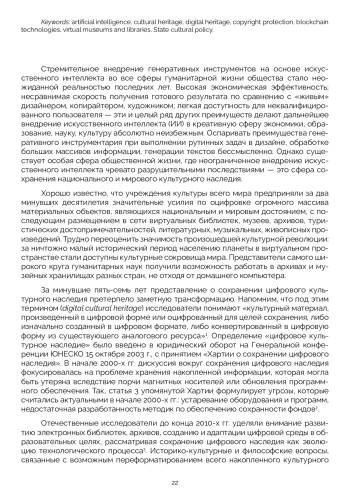 Внедрение генеративных инструментов на основе искусственного интеллекта во все сферы гуманитарной жизни общества стало неожиданной реальностью последних лет. Существует особая сфера общественной жизни, где неограниченное внедрение искусственного интеллекта чревато разрушительными последствиями — это сфера сохранения национального и мирового культурного наследия. Деятельность национальных правительств и частных компаний по созданию виртуальных коллекций культурного наследия продолжается активными темпами. В Российской Федерации созданием виртуальных коллекций исторического и культурного наследия занимается как государство в лице учреждений культуры, так и немногочисленные энтузиасты. Новая цифровая реальность, в контексте защиты авторских произведений от искажения искусственным интеллектом, заставляет некоторые издательства предпринимать шаги по защите оригинальных текстов. Власти многих стран мира предпринимают конкретные действия по созданию нормативно-правовой основы использования генеративных инструментов. Ранее уже предлагалась идея защиты национального культурного наследия, размещаемого в цифровом виде в открытом доступе, через присвоение «цифровым подлинникам» NFT невзаимозаменяемых токенов. Создание на основе блокчейна национального хранилища цифрового наследия, генеральной целью которого станет сохранение традиционной и суверенной культурной матрицы, окупит все возможные затраты на нее, сохранив цифровое культурное наследие страны для будущих поколений. Насущной необходимостью является создание национальной нейросети, ориентированной на нужды и ценности российской культуры и образования, алгоритмы которой будут базироваться на примате сохранения цифрового наследия страны.