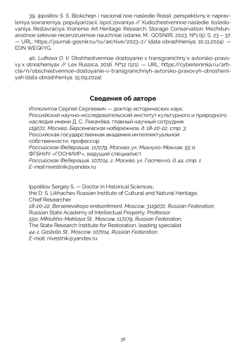 41. Ипполитов С. С. Блокчейн и национальное наследие России: перспективные направления сохранения, популяризации, использования // Художественное наследие. Исследования. Реставрация. Хранение. Art Heritage. Research. Storage. Conservation. Международное сетевое рецензируемое научное издание. М.: ГОСНИИР, 2023. №1 (5). С. 23 - 37. - URL: https://journalgosniir.ru/ru/archive/2023-2/ (дата обращения: 10.11.2024). EDN: WEGKYG