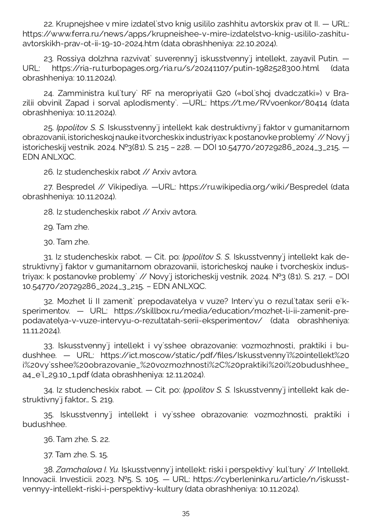 35. Из студенческих работ. - Цит. по: Ипполитов С. С. Искусственный интеллект как деструктивный фактор в гуманитарном образовании, исторической науке и творческих индустриях: к постановке проблемы // Новый исторический вестник. 2024. №3 (81). С. 217. DOI: 10.54770/20729286_2024_3_215 EDN: ANLXQC