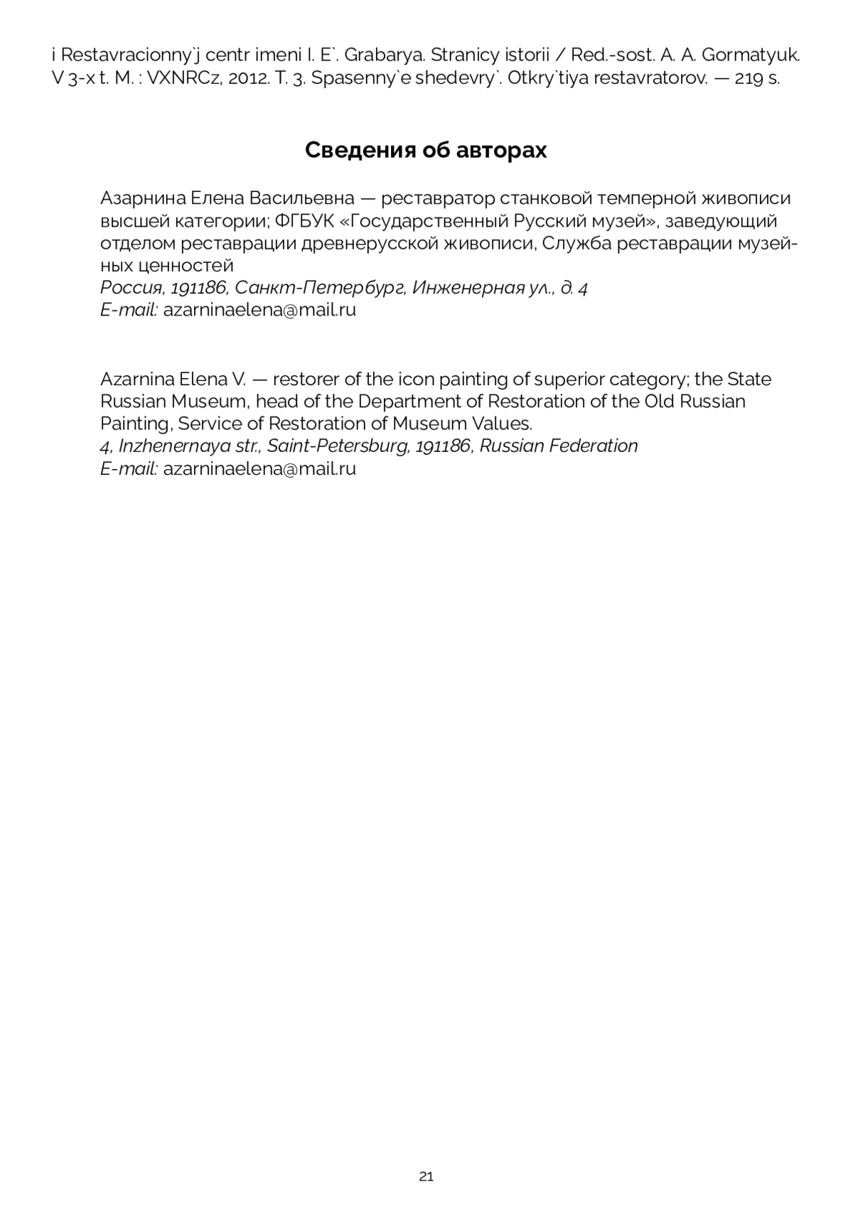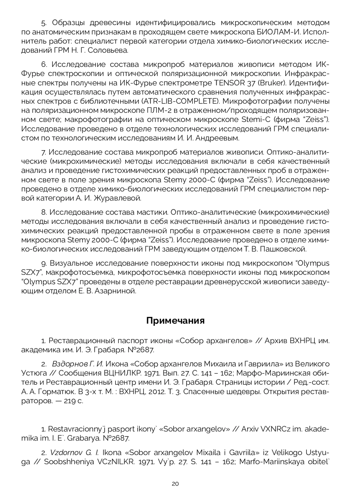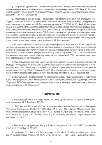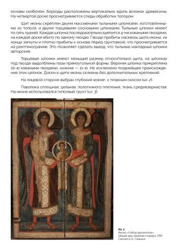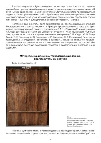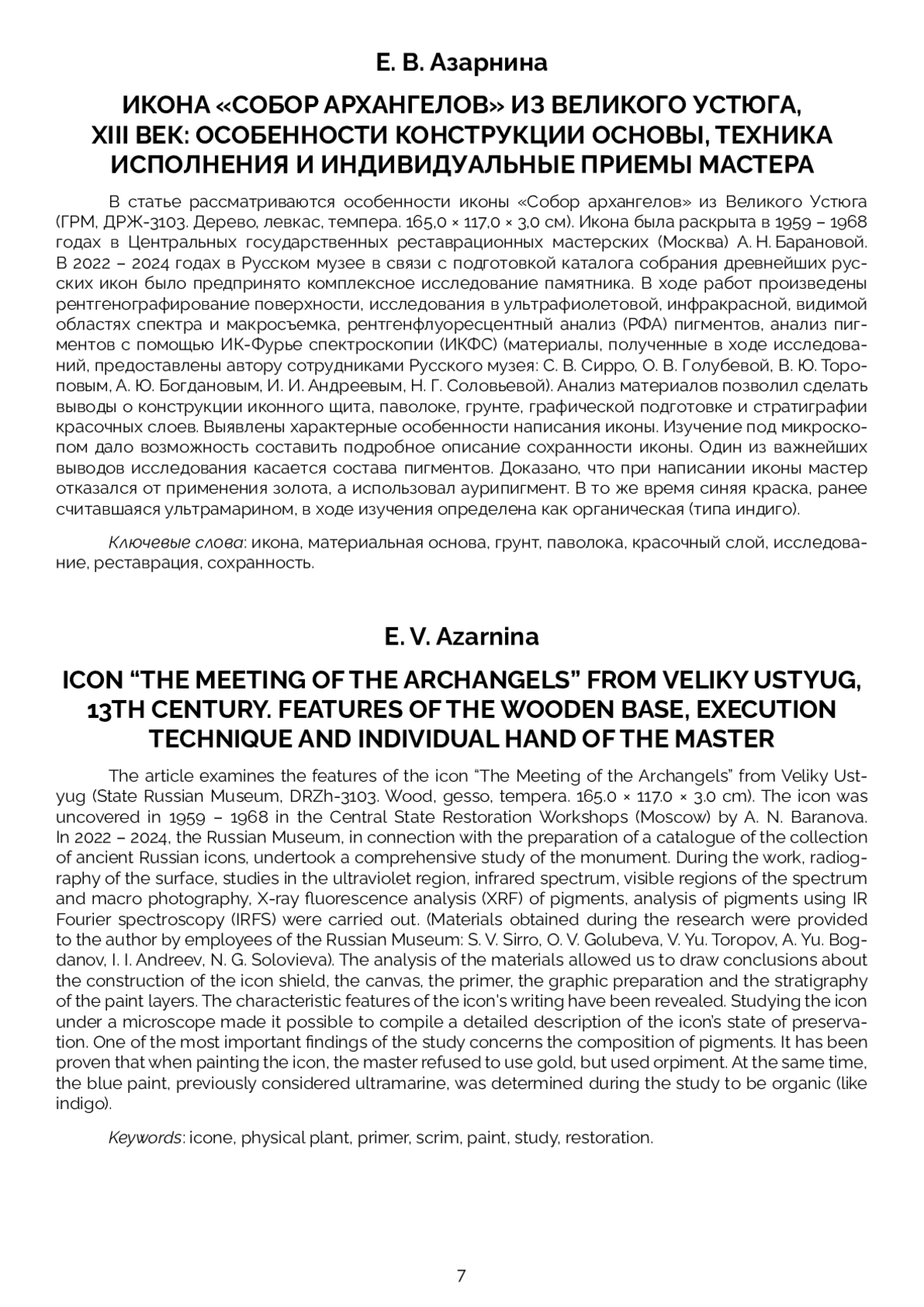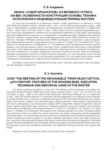 В статье рассматриваются особенности иконы «Собор архангелов» из Великого Устюга (ГРМ, ДРЖ-3103. Дерево, левкас, темпера. 165,0 × 117,0 × 3,0 см). Икона была раскрыта в 1959 – 1968 годах в Центральных государственных реставрационных мастерских (Москва) А. Н. Барановой. В 2022 – 2024 годах в Русском музее в связи с подготовкой каталога собрания древнейших русских икон было предпринято комплексное исследование памятника. В ходе работ произведены рентгенографирование поверхности, исследования в ультрафиолетовой, инфракрасной, видимой областях спектра и макросъемка, рентгенфлуоресцентный анализ (РФА) пигментов, анализ пигментов с помощью ИК-Фурье спектроскопии (ИКФС) (материалы, полученные в ходе исследований, предоставлены автору сотрудниками Русского музея: С. В. Сирро, О. В. Голубевой, В. Ю. Тороповым, А. Ю. Богдановым, И. И. Андреевым, Н. Г. Соловьевой). Анализ материалов позволил сделать выводы о конструкции иконного щита, паволоке, грунте, графической подготовке и стратиграфии красочных слоев. Выявлены характерные особенности написания иконы. Изучение под микроскопом дало возможность составить подробное описание сохранности иконы. Один из важнейших выводов исследования касается состава пигментов. Доказано, что при написании иконы мастер отказался от применения золота, а использовал аурипигмент. В то же время синяя краска, ранее считавшаяся ультрамарином, в ходе изучения определена как органическая (типа индиго).