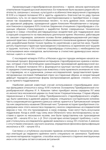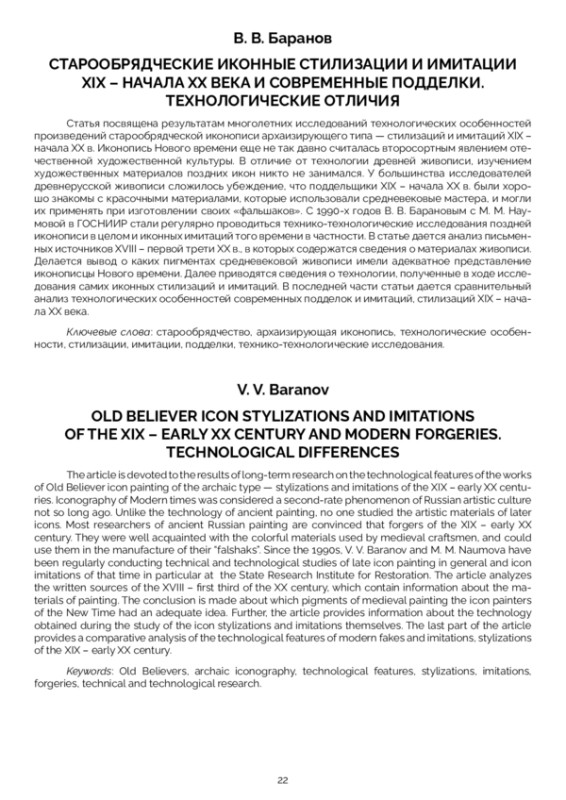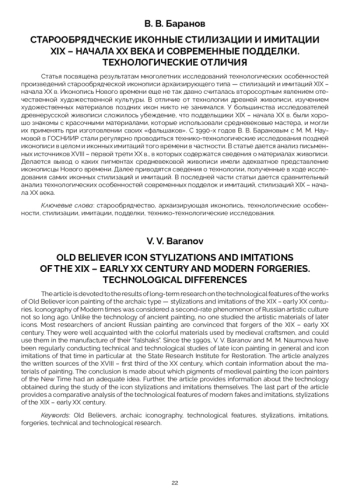Статья посвящена результатам многолетних исследований технологических особенностей произведений старообрядческой иконописи архаизирующего типа — стилизаций и имитаций XIX – начала XX в. Иконопись Нового времени еще не так давно считалась второсортным явлением отечественной художественной культуры. В отличие от технологии древней живописи, изучением художественных материалов поздних икон никто не занимался. У большинства исследователей древнерусской живописи сложилось убеждение, что поддельщики XIX – начала XX в. были хорошо знакомы с красочными материалами, которые использовали средневековые мастера, и могли их применять при изготовлении своих «фальшаков». С 1990-х годов В. В. Барановым с М. М. Наумовой в ГОСНИИР стали регулярно проводиться технико-технологические исследования поздней иконописи в целом и иконных имитаций того времени в частности. В статье дается анализ письменных источников XVIII – первой трети XX в., в которых содержатся сведения о материалах живописи. Делается вывод о каких пигментах средневековой живописи имели адекватное представление иконописцы Нового времени. Далее приводятся сведения о технологии, полученные в ходе исследования самих иконных стилизаций и имитаций. В последней части статьи дается сравнительный анализ технологических особенностей современных подделок и имитаций, стилизаций XIX – начала XX века.
