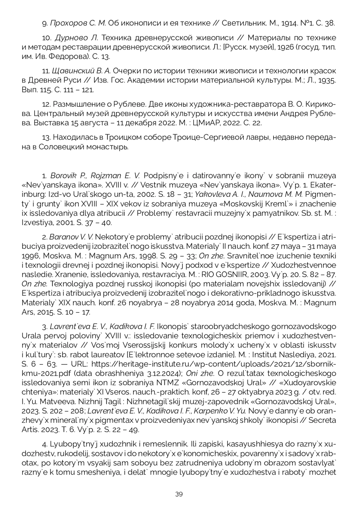 3. Лаврентьева Е. В., Кадикова И. Ф. Иконопись старообрядческого горнозаводского Урала первой половины XVIII в.: исследование технологических приемов и художественных материалов // Восьмой Всероссийский конкурс молодых ученых в области искусств и культуры: сб. работ лауреатов [Электронное сетевое издание]. М.: Институт Наследия, 2021. С. 6 - 63. - URL: https://heritage institute.ru/wpcontent/uploads/2021/12/sbornik kmu 2021.pdf (дата обращения 3.12.2024).