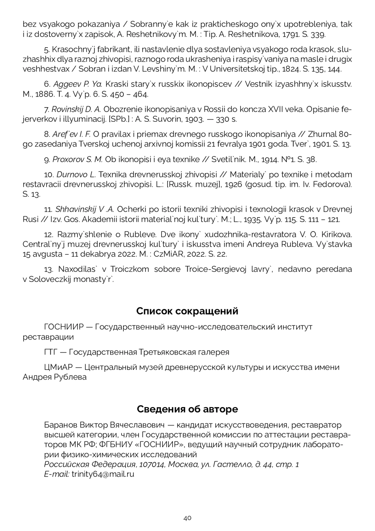 Он же. Технология поздней русской иконописи (по материалам новейших исследований) // Экспертиза и атрибуция произведений изобразительного и декоративно прикладного искусства. Материалы XIX науч. конф. 26 ноября - 28 ноября 2014 года, Москва. М.: Магнум Арс, 2015. С. 10 - 17.