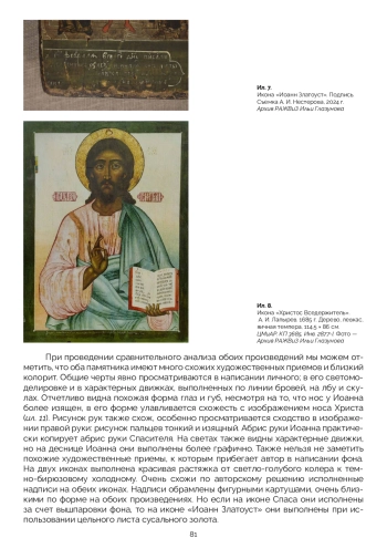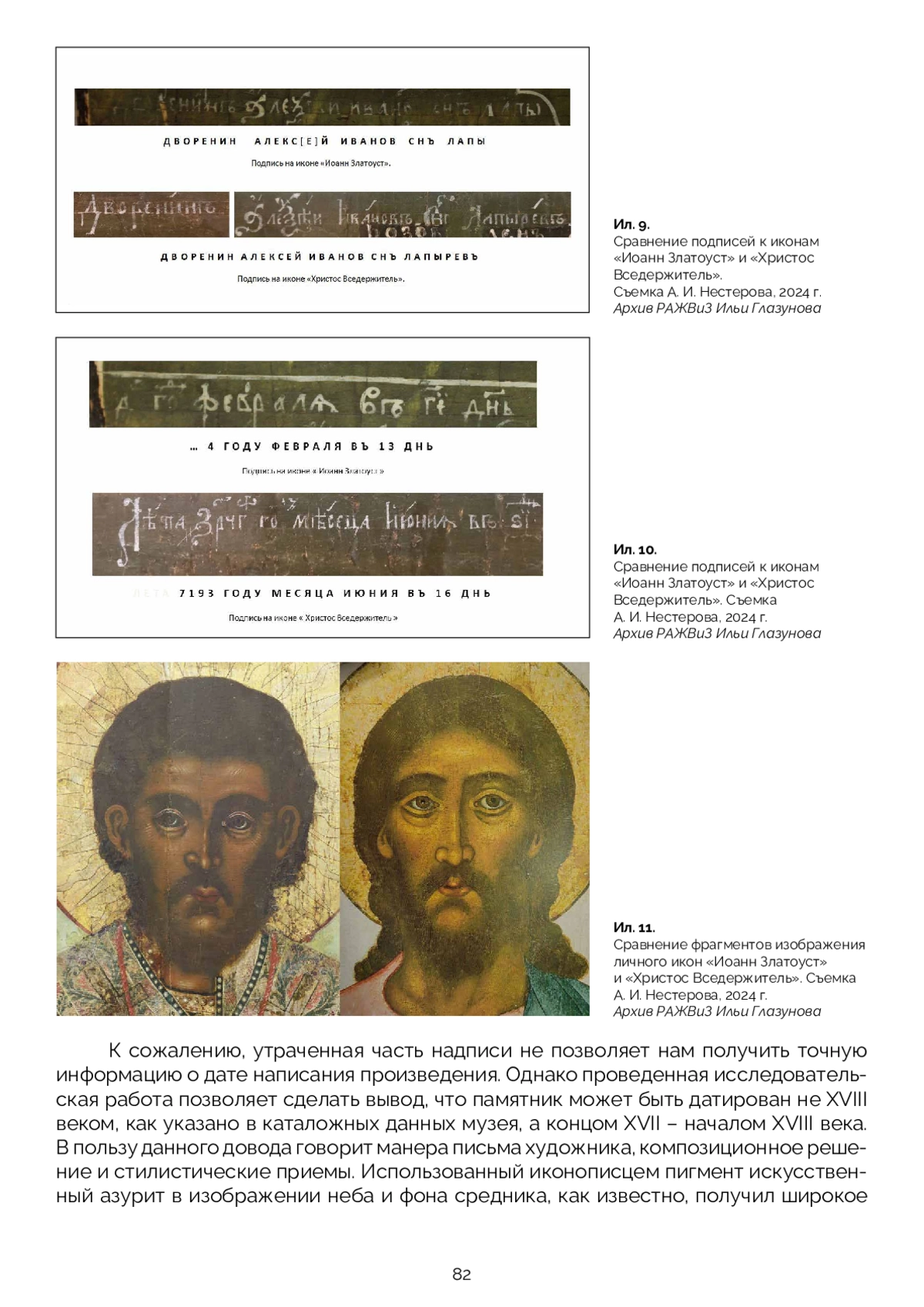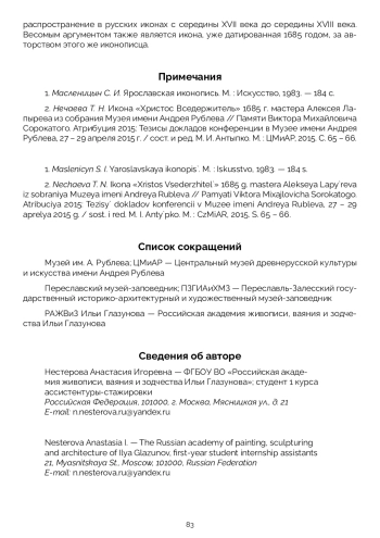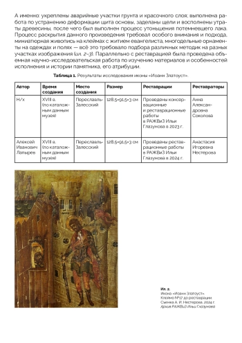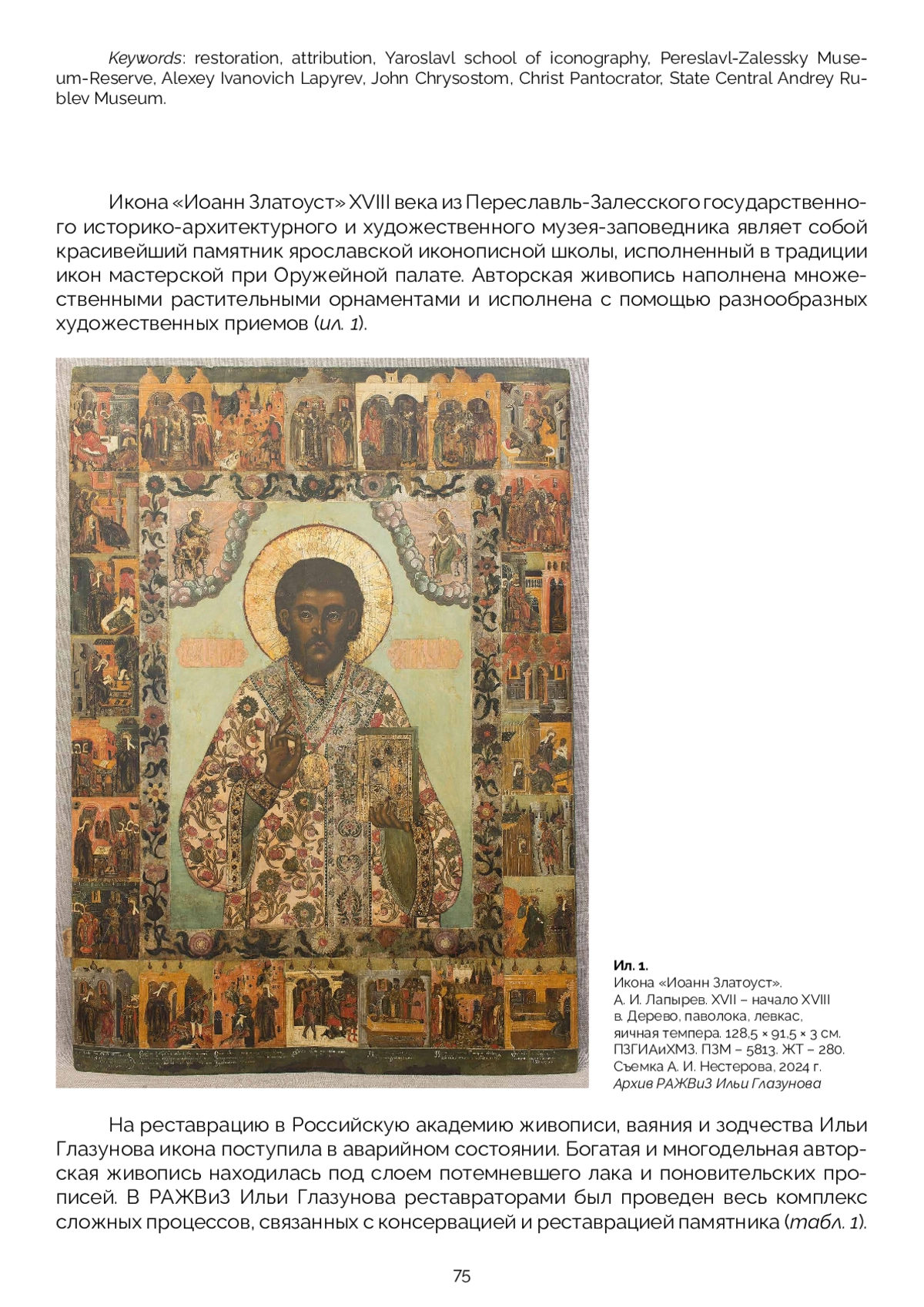 Цель статьи — рассказать о реставрации и атрибуции уникального памятника иконописи, происходящего из собрания Переславль-Залесского государственного историко-архитектурного и художественного музея-заповедника. В Российской академии живописи, ваяния и зодчества Ильи Глазунова был выполнен комплекс работ по консервации и реставрации иконы «Иоанн Златоуст». Параллельно с реставрацией была проведена научно-исследовательская работа по изучению истории памятника и его атрибуции. Особое внимание в статье уделяется изучению художественных особенностей иконы «Иоанн Златоуст», рассматривается специфика сюжетов и композиционных решений. Важной частью работы с памятником стало открытие авторской подписи на иконе, которая дает возможность узнать личность иконописца. В ходе поисков других произведений иконописца Алексея Ивановича Лапырева была найдена икона из собрания Музея им. А. Рублева «Христос Вседержитель», которая также имеет подпись, где имя, отчество и фамилия иконописца совпадают с подписью на реставрируемой иконе. В статье также сравниваются иконы «Иоанн Златоуст» и «Христос Вседержитель». Характер письма, светотеневая моделировка личного и колорит схожи на двух иконах и имеют общие черты. Несмотря на то, что на иконе из собрания Музея им. А. Рублева указана дата написания, назвать точную датировку иконы «Иоанн Златоуст» не представляется возможным из-за утраченной части надписи. В заключение автор делает вывод, что икону можно отнести к ярославской школе иконописи и уточняет датировку.