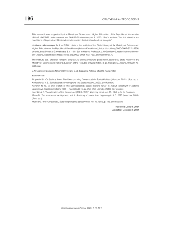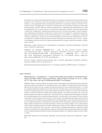 На основе архивных материалов в статье раскрываются некоторые аспекты политики партийного государства в отношении автономных элит казахского аула Актюбинской губернии в 1920-е гг. Центральная партийно-советская бюрократия считала, что казахские баи были в состоянии воспрепятствовать действиям государства, способны к сопротивлению Советской власти. Стремясь полностью ликвидировать политическое и экономическое влияние лиц байской группы на местное население, уничтожить их как своих политических противников, партийное государство принимает решение изолировать арестованных не только от родных мест, но и выселить за пределы КазахскойРеспублики. Уголовное преследование было даже не за прямые антиправительственные действия или призывы к ним и тем более не за попытку вооруженной борьбы, а только за саму социальную принадлежность к так называемым байско-аксакальским элементам. Социальный порядок в кочевой и полукочевой общине, державшийся на консенсусе большинства, был сознательно разрушен практиками революционного насилия. Байство, являясь традиционной и неформальной организацией, по своей консервативной сути не было склонно к политическим авантюрам, избегало отрытой конфронтации с Советским государством. Традиционные казахские элиты и жители аулов ждали от власти коммунистов соблюдения дооктябрьских традиций при сборе налогов и возможности сохранения привилегированного положения семьями элитных групп. Большевики, к концу 1920-х гг. вернувшись к практикам«военного коммунизма», пошли по пути полной ликвидации института частной собственности. Политика партийного государства формировала массовое недовольство населения аула. По сути, государство направило все свои усилия на создание революционной ситуации в казахском кочевом и полукочевом социуме.