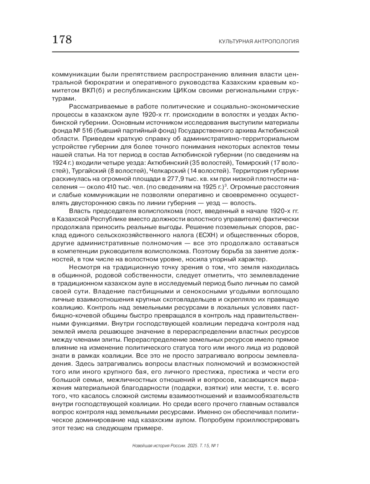 Попытки объяснить масштабные общественные изменения первого послеоктябрьского десятилетия в Казахстане приводят нас к теоретическим вопросам политической науки, экономики и социального поведения. Земля, как известно, — главная ценность аграрного общества. Доступ к ней, контроль за земельными ресурсами стал основным объектом борьбы между централизованной бюрократией и представителями «эксплуататорского» класса казахского аула в 1920-е гг. Для более точного понимания сути проблемы обратим внимание на некоторые важные аспекты территориально-хозяйственного устройства аула. По административной реформе 1867–1868 гг. были образованы уезды, состоявшие из нескольких волостей. Те, свою очередь, состояли из нескольких административных аулов со своими территориальными границами. Административный аул состоял из нескольких мелких хозяйственных аулов
