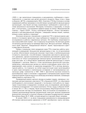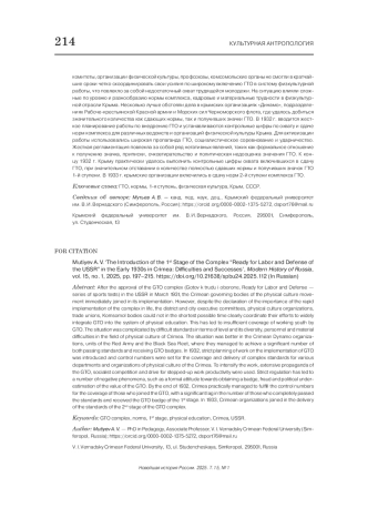 На основе анализа архивных документов, которые впервые введены в научный оборот, рассматриваются вопросы внедрения 1-й ступени комплекса «Готов к труду и обороне СССР» в Крыму в начале 1930-х гг. После утверждения комплекса ГТО в СССР в марте 1931 г. крымские органы управления физкультурным движением сразу же включились в его реализацию. Однако, несмотря на декларацию важности быстрейшего внедрения комплекса в жизнь, районные и городские исполнительныекомитеты, организации физической культуры, профсоюзы, комсомольские органы не смогли в кратчайшие сроки четко скоординировать свои усилия по широкому включению ГТО в систему физкультурной работы, что повлекло за собой недостаточный охват трудящейся молодежи. На ситуацию влияли сложные по уровню и разнообразию нормы комплекса, кадровые и материальные трудности в физкультурной отрасли Крыма. Несколько лучше обстояли дела в крымских организациях «Динамо», подразделениях Рабоче-крестьянской Красной армии и Морских сил Черноморского флота, где удалось добиться значительного количества как сдающих нормы, так и получивших значки ГТО. В 1932 г. вводится жесткое планирование работы по внедрению ГТО и устанавливаются контрольные цифры по охвату и сдаче норм комплекса для различных ведомств и организаций физической культуры Крыма. Для активизации работы использовались широкая пропаганда ГТО, социалистическое соревнование и ударничество. Жесткая регламентация повлекла за собой ряд негативных явлений, таких как формальное отношение к получению значка, приписки, очковтирательство и политическая недооценка значения ГТО. К концу 1932 г. Крыму практически удалось выполнить контрольные цифры охвата включившихся в сдачу ГТО, при значительном отставании в количестве полностью сдавших нормы и получивших значок ГТО 1-й ступени. В 1933 г. крымские организации включились в сдачу норм 2-й ступени комплекса ГТО.
