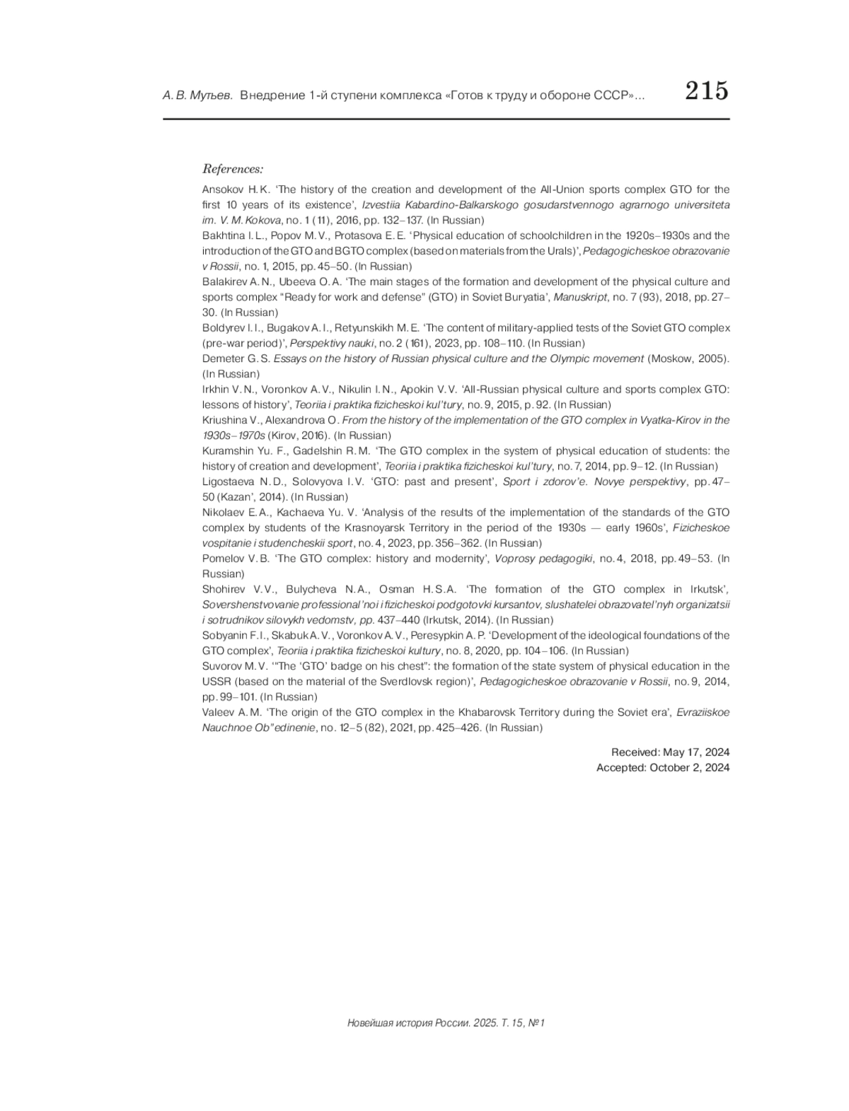 14. Бахтина И. Л., Попов М. В., Протасова Э. Е. Физическое воспитание школьников в 1920-1930-е гг. и введение комплекса ГТО и БГТО (на материалах Урала) // Педагогическое образование в России. 2015. № 1. С. 45-50.