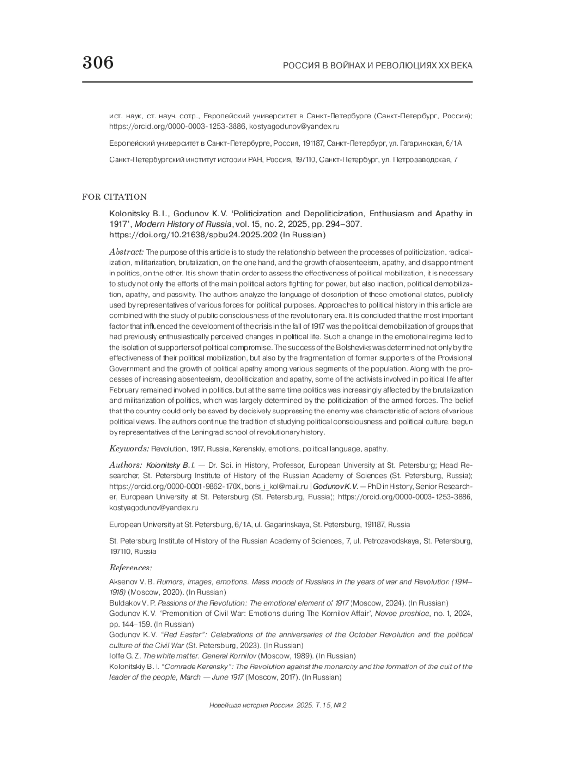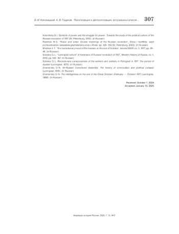 25. Годунов К. В. Предчувствие гражданской войны: эмоции в дни корниловского выступления // Новое прошлое. 2024. № 1. С. 144-159. EDN: ZNRGAU