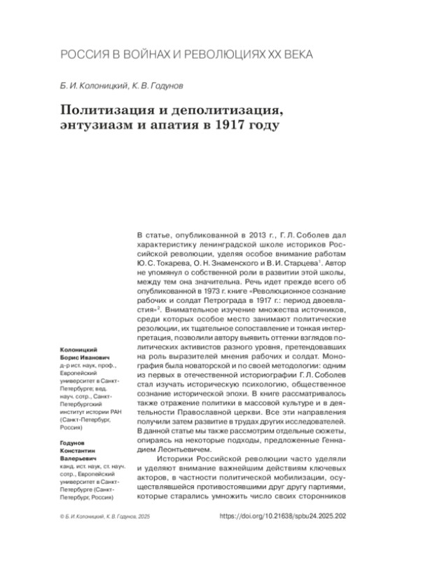 В статье, опубликованной в 2013 г., Г. Л. Соболев дал характеристику ленинградской школе историков Российской революции, уделяя особое внимание работам Ю. С. Токарева, О. Н. Знаменского и В. И. Старцева 1. Автор не упомянул о собственной роли в развитии этой школы, между тем она значительна. Речь идет прежде всего об опубликованной в 1973 г. книге «Революционное сознание рабочих и солдат Петрограда в 1917 г.: период двоевластия» 2. Внимательное изучение множества источников, среди которых особое место занимают политические резолюции, их тщательное сопоставление и тонкая интерпретация, позволили автору выявить оттенки взглядов политических активистов разного уровня, претендовавших на роль выразителей мнения рабочих и солдат. Монография была новаторской и по своей методологии: одним из первых в отечественной историографии Г. Л. Соболев стал изучать историческую психологию, общественное сознание исторической эпохи. В книге рассматривалось также отражение политики в массовой культуре и в деятельности Православной церкви. Все эти направления получили затем развитие в трудах других исследователей. В данной статье мы также рассмотрим отдельные сюжеты, опираясь на некоторые подходы, предложенные Геннадием Леонтьевичем