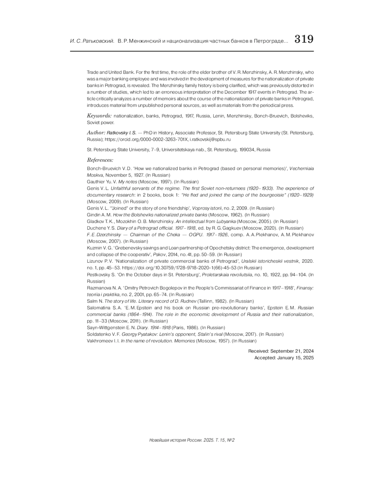 8. Лизунов П. В. Национализация частных коммерческих банков Петрограда // Уральский исторический вестник. 2020. № 1. С. 46. EDN: VKLFND