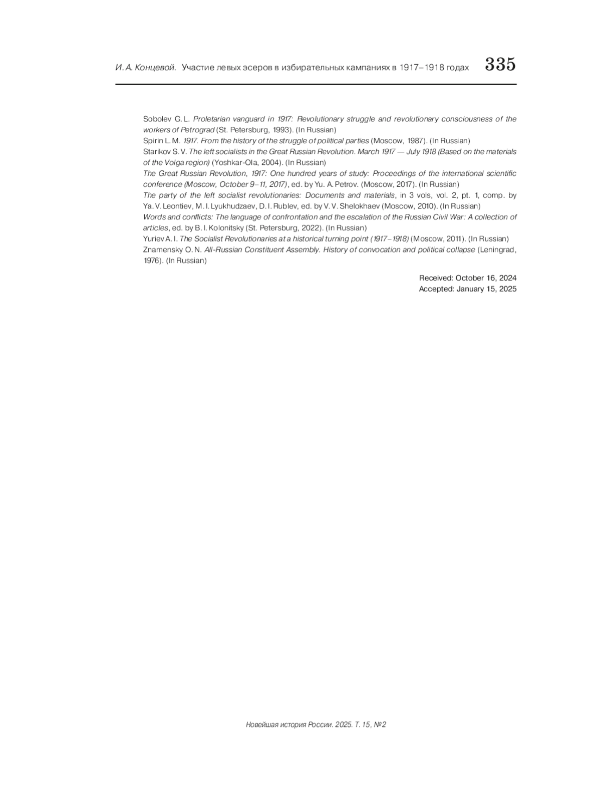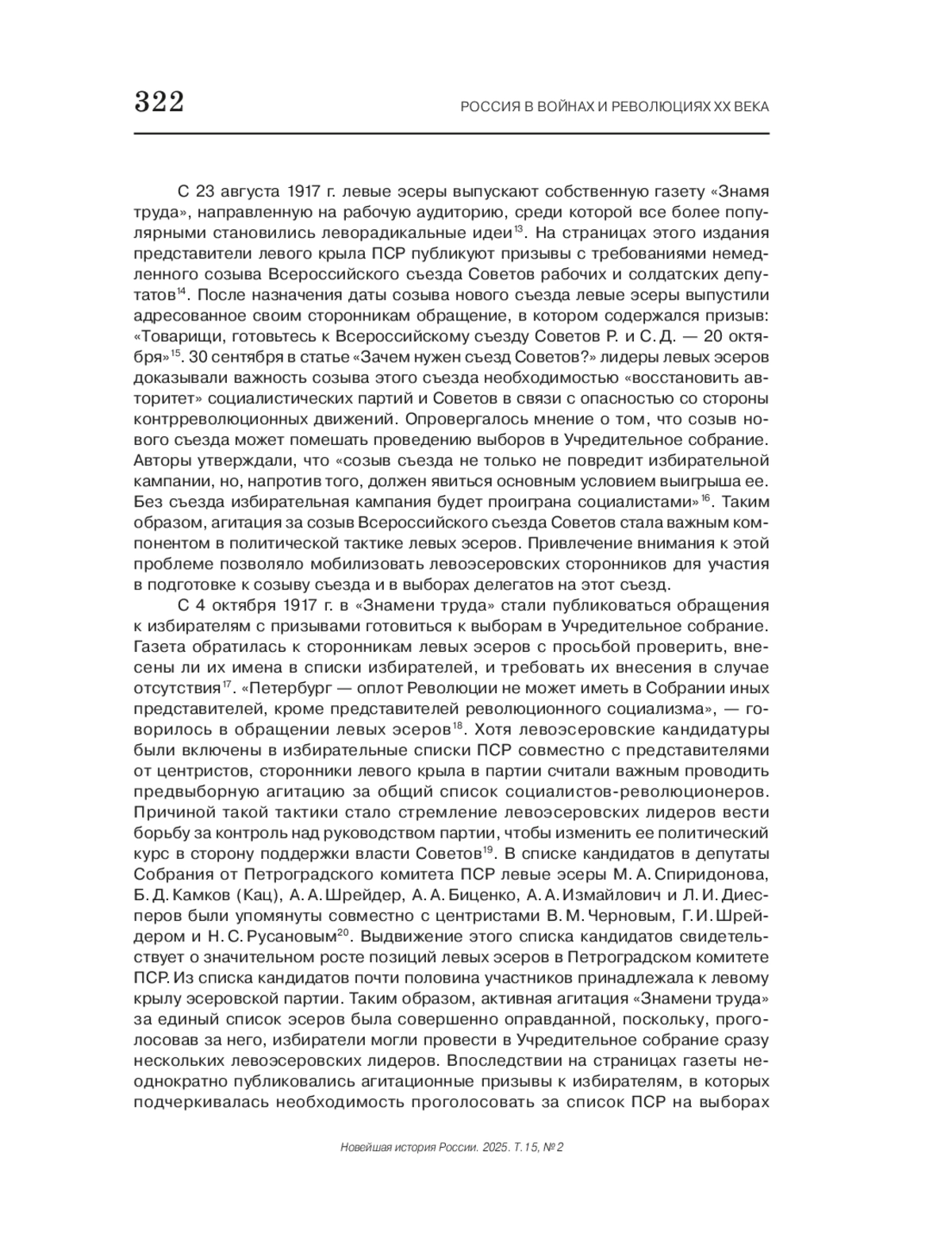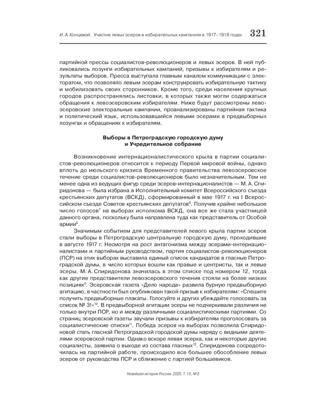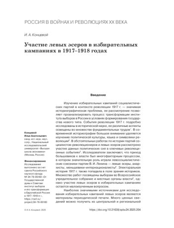 Изучение избирательных кампаний социалистических партий в контексте революции 1917 г. — значимая историографическая проблема, ее рассмотрение позволяет проанализировать процесс трансформации института выборов в России в условиях формирования государства нового типа. События революции 1917 г. подробно исследованы в исторической науке, ее различные аспекты освещены во множестве фундаментальных трудов1. В современной историографии большое внимание уделяется изучению политической культуры, языка и символики революции 2. В обстоятельных работах по истории партий социалистов-революционеров и левых эсеров рассмотрено участие данных политических сил в ключевых революционных событиях 3. Исследователи заключают, что приход большевиков к власти был многофакторным процессом, в котором значительную роль играли левосоциалистические союзники партии В. И. Ленина — левые эсеры, анархисты, меньшевики-интернационалисты 4. Электоральная история 1917 г. также попадала в поле зрения историков. Множество работ посвящены выборам во Всероссийское учредительное собрание и местные органы власти5, однако участие левых эсеров в избирательных кампаниях остается малоизученным вопросом