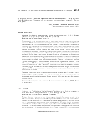 В статье рассматривается участие левых эсеров в избирательных кампаниях в ходе революции 1917 г. Выделение левого крыла в партии социалистов-революционеров способствовало формированию самостоятельной политической силы, которая в условиях политической конкуренции стремилась получить поддержку со стороны населения России и накопить собственный политический капитал. В 1917 г. левые эсеры как самостоятельная партия принимали участие лишь в некоторых выборах, рассчитывая получить контроль над всей партией эсеров. Участие левых эсеров в избирательной кампании в Петроградскую городскую думу показало, что новая партия имеет крайне малую поддержку среди петроградских избирателей. Для идейного противостояния с руководством эсеровской партии левые эсеры избрали публичную стратегию, направленную на формирование образа члена их партии как единственного защитника главных эсеровских принципов. В политическом языке агитационных обращений к избирателям левые эсеры стремились представить свою партию единственной политической силой, выступающей за «власть советов» и отстаивающей интересы«трудящегося населения». С такими лозунгами они шли на все избирательные кампании в конце 1917 - середине 1918 г. Автор приходит к выводу, что критика политики большевиков стала проявляться в левоэсеровской агитации только к июню 1918 г. и зачастую носила довольно сдержанный характер. Отдельные эпизоды предвыборного противостояния большевиков и левых эсеров предусматривали осуждение РКП(б) за «соглашательство» с Германией в связи с подписанием Брестского договора и исполнением его условий.
