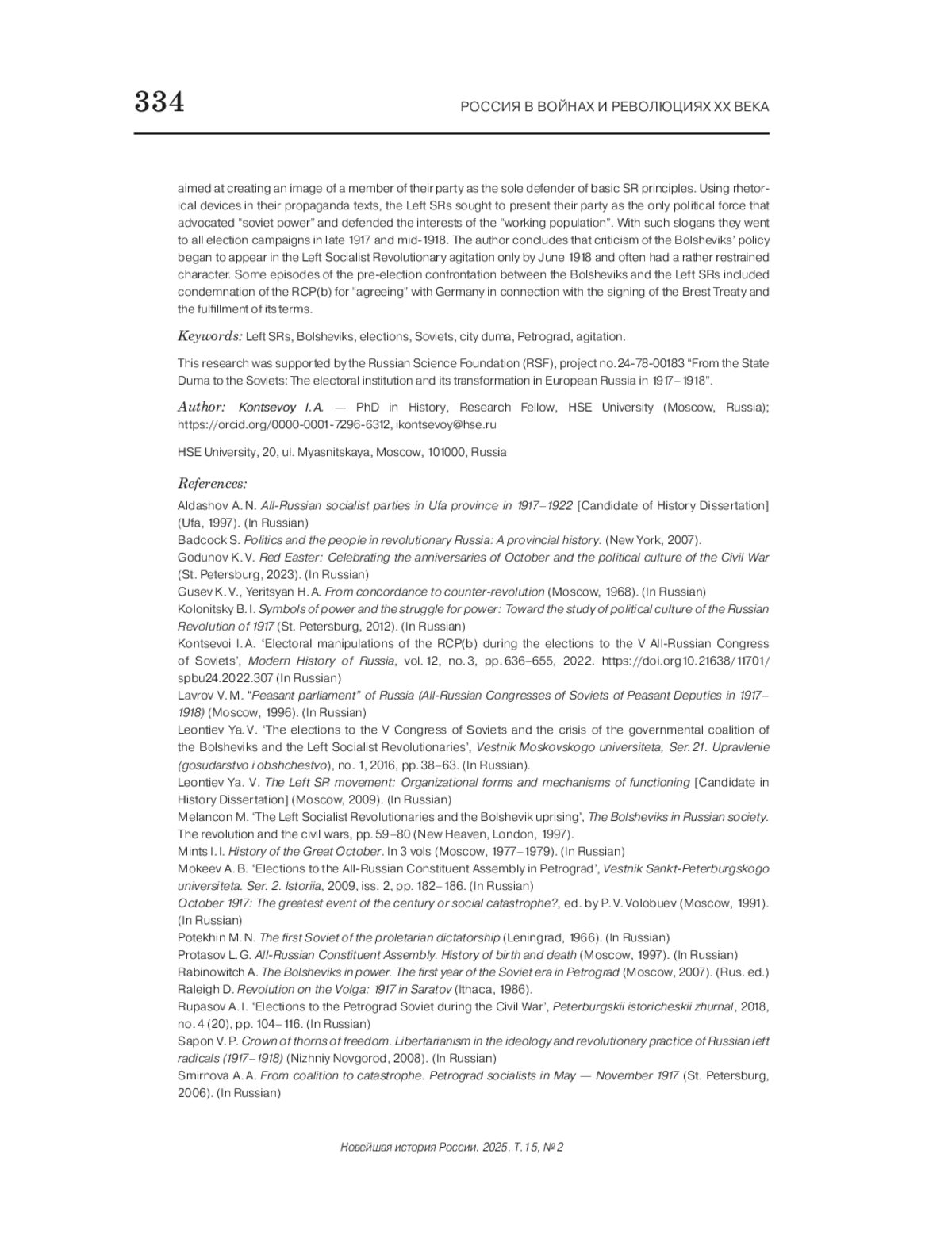 27. Леонтьев Я. В. Выборы на V съезд Советов и кризис правительственного блока большевиков и левых эсеров // Вестник Московского университета. Сер. 21: Государство и общество. 2016. № 1. С. 38-63.