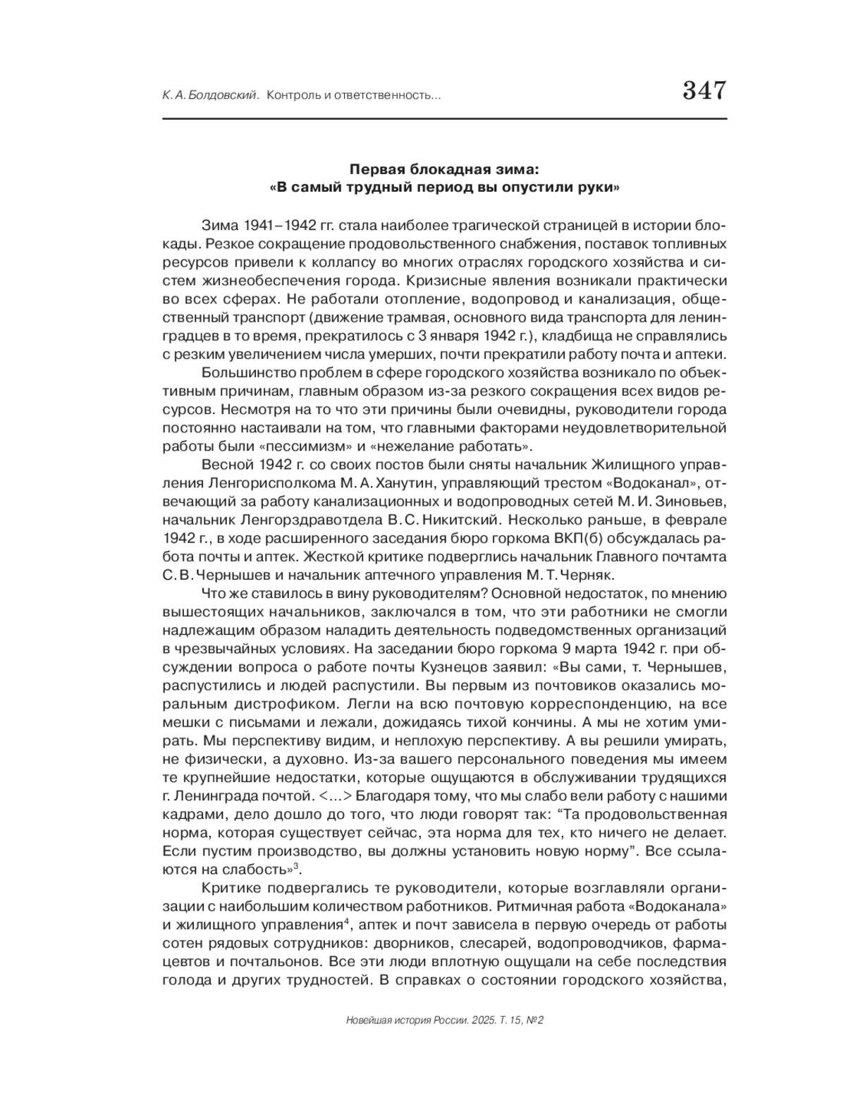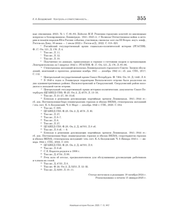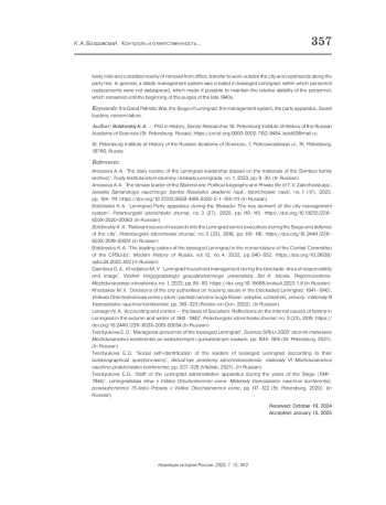 3. Болдовский К. А. Актуальные вопросы исследований управленческих кадров Ленинграда периода обороны и блокады города // Петербургский исторический журнал. 2019. № 3 (23). С. 110-116. EDN: RWXMQV